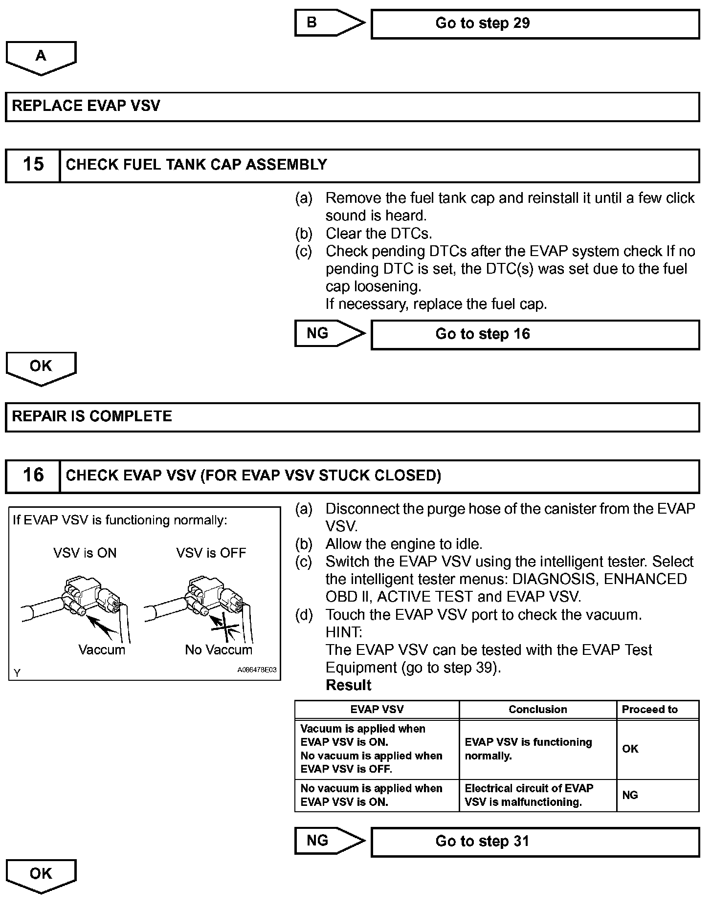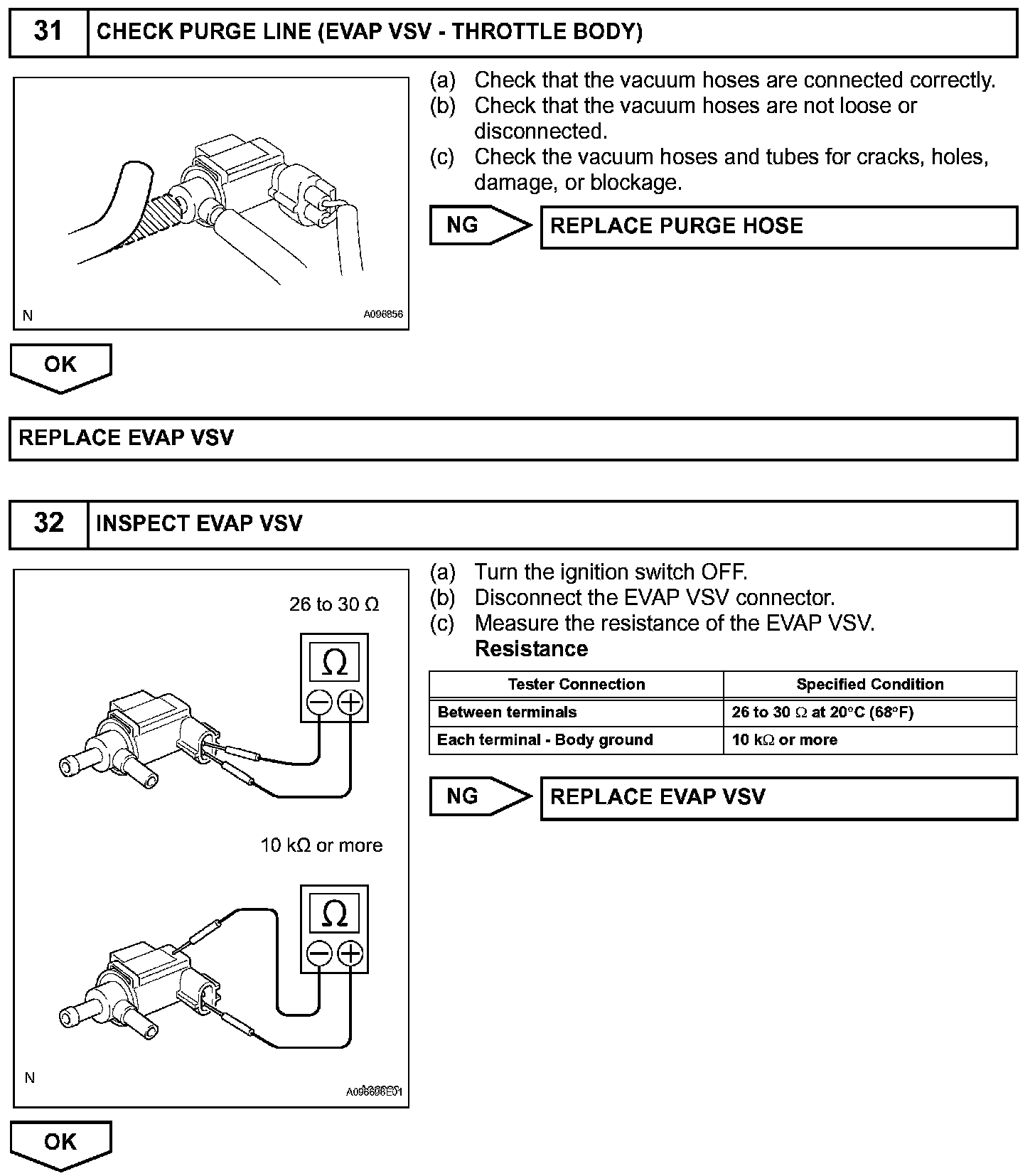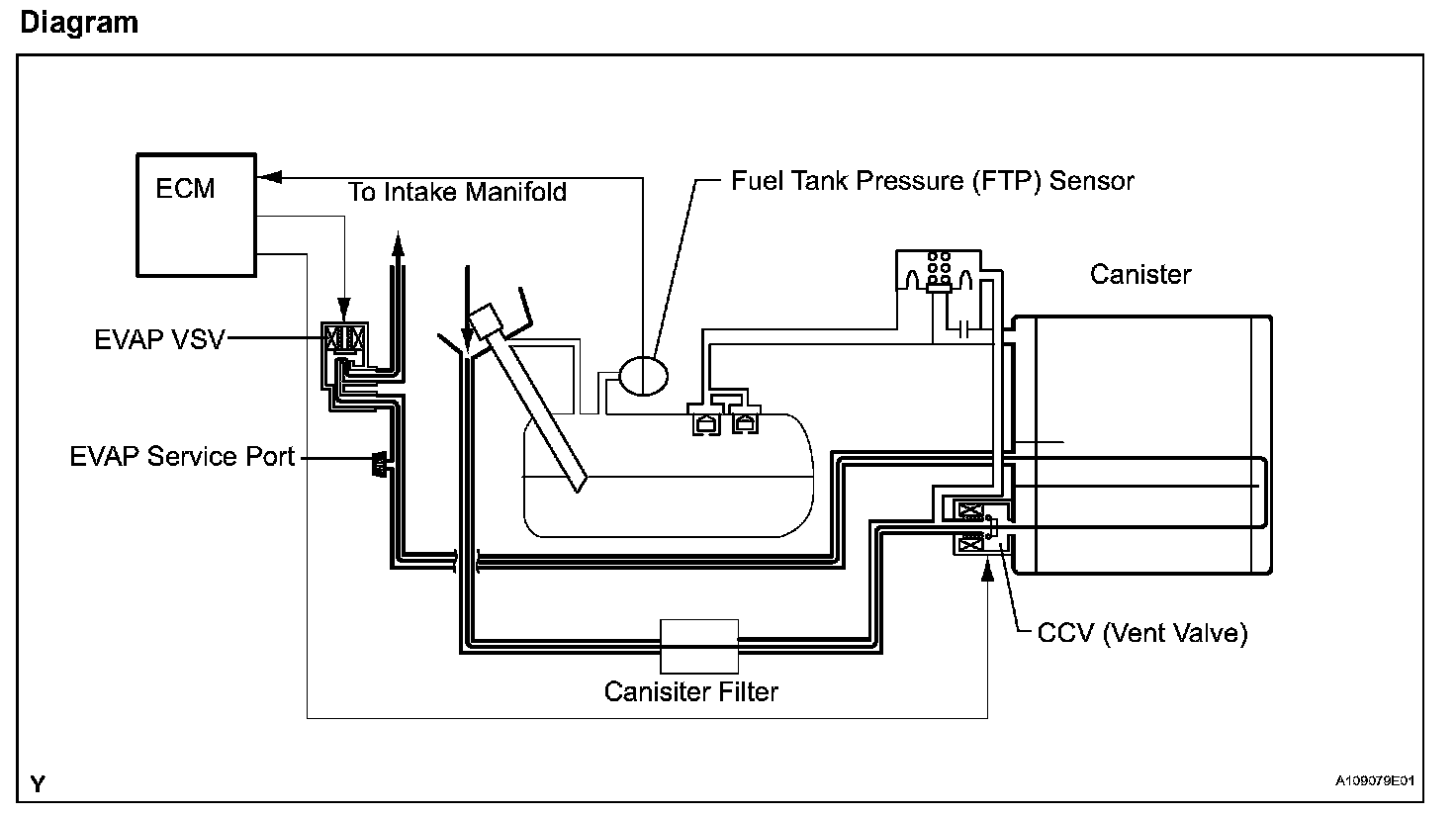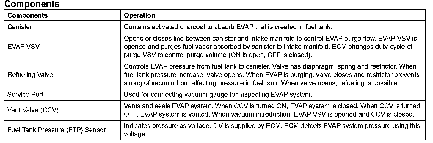 When predetermined conditions (closed loop, etc.) are met, the EVAP VSV is opened and stored fuel vapor in the canister is purged to the intake manifold. The ECM changes duty-cycle to the EVAP VSV to control purge flow volume. Purge flow volume is determined by the intake manifold pressure. Atmospheric pressure is allowed into the canister through the vent valve (CCV) to ensure that purge flow is maintained when negative pressure (vacuum) is applied to the canister. This EVAP system contains given components: