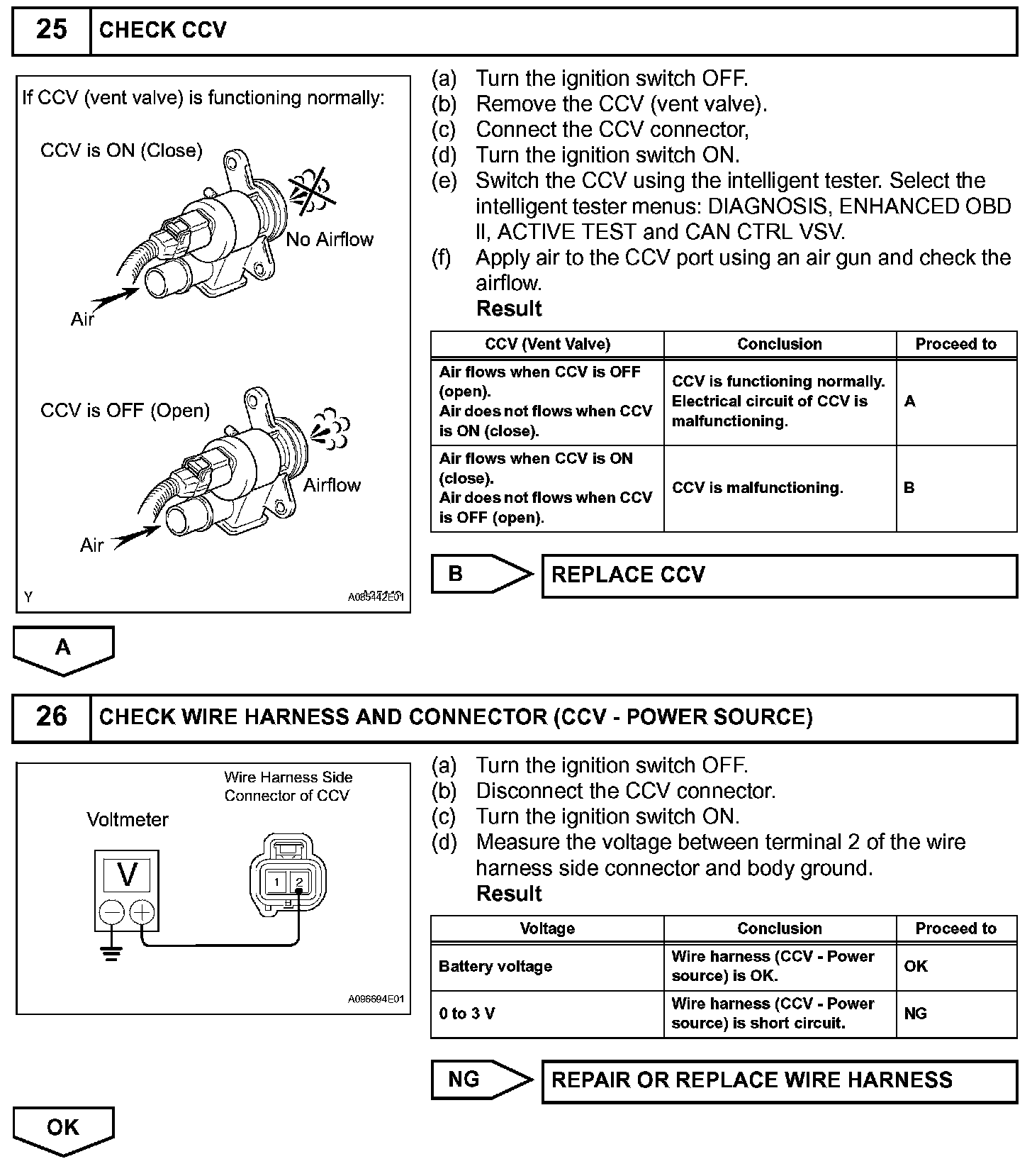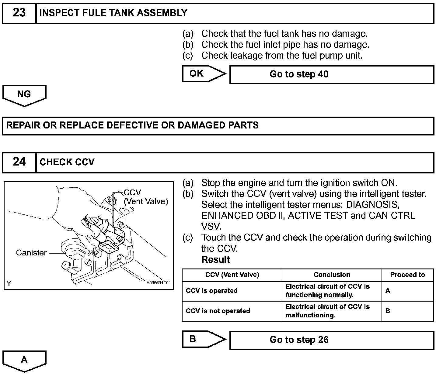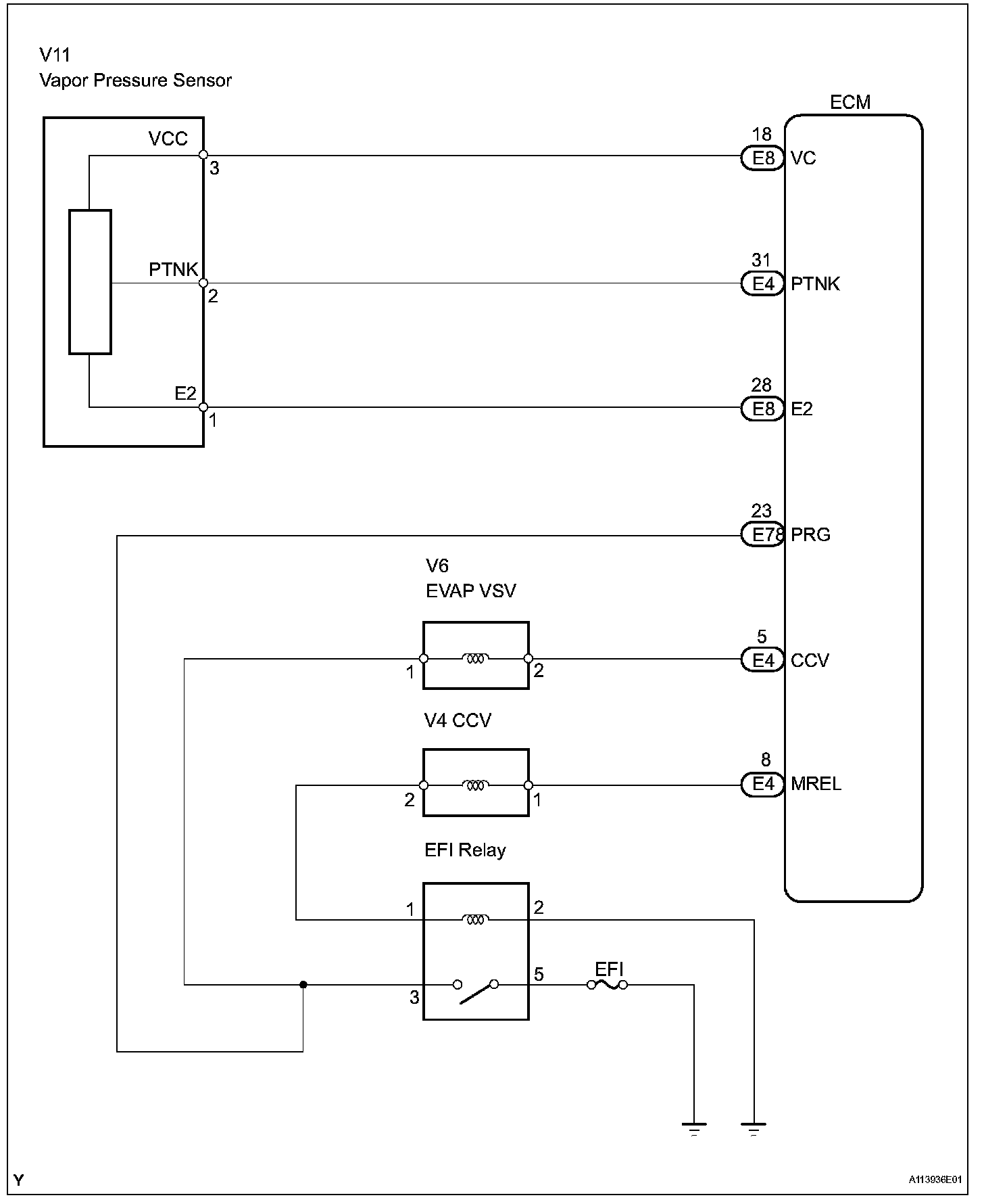 When predetermined conditions (closed loop, etc.) are met, the EVAP VSV is opened and stored fuel vapor in the canister is purged to the intake manifold. The ECM changes duty-cycle to the EVAP VSV to control purge flow volume. Purge flow volume is determined by the intake manifold pressure. Atmospheric pressure is allowed into the canister through the vent valve (CCV) to ensure that purge flow is maintained when negative pressure (vacuum) is applied to the canister. This EVAP system contains given components: