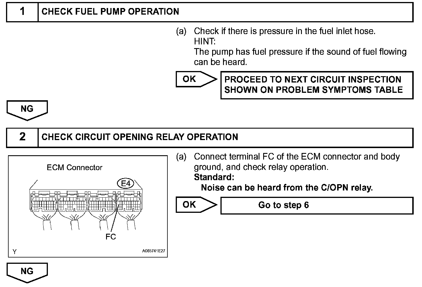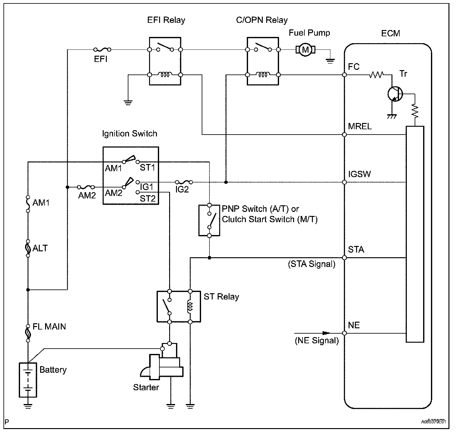 When the STA signal and NE signal are input to the ECM, Tr is turned ON, current flows to coil of the circuit opening relay (marking: C/OPN), the relay switches ON, power is supplied to the fuel pump and the fuel pump operates.