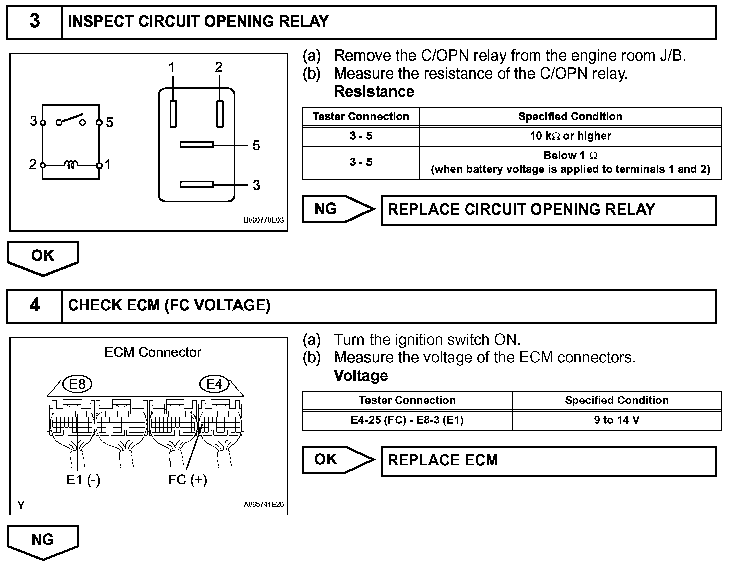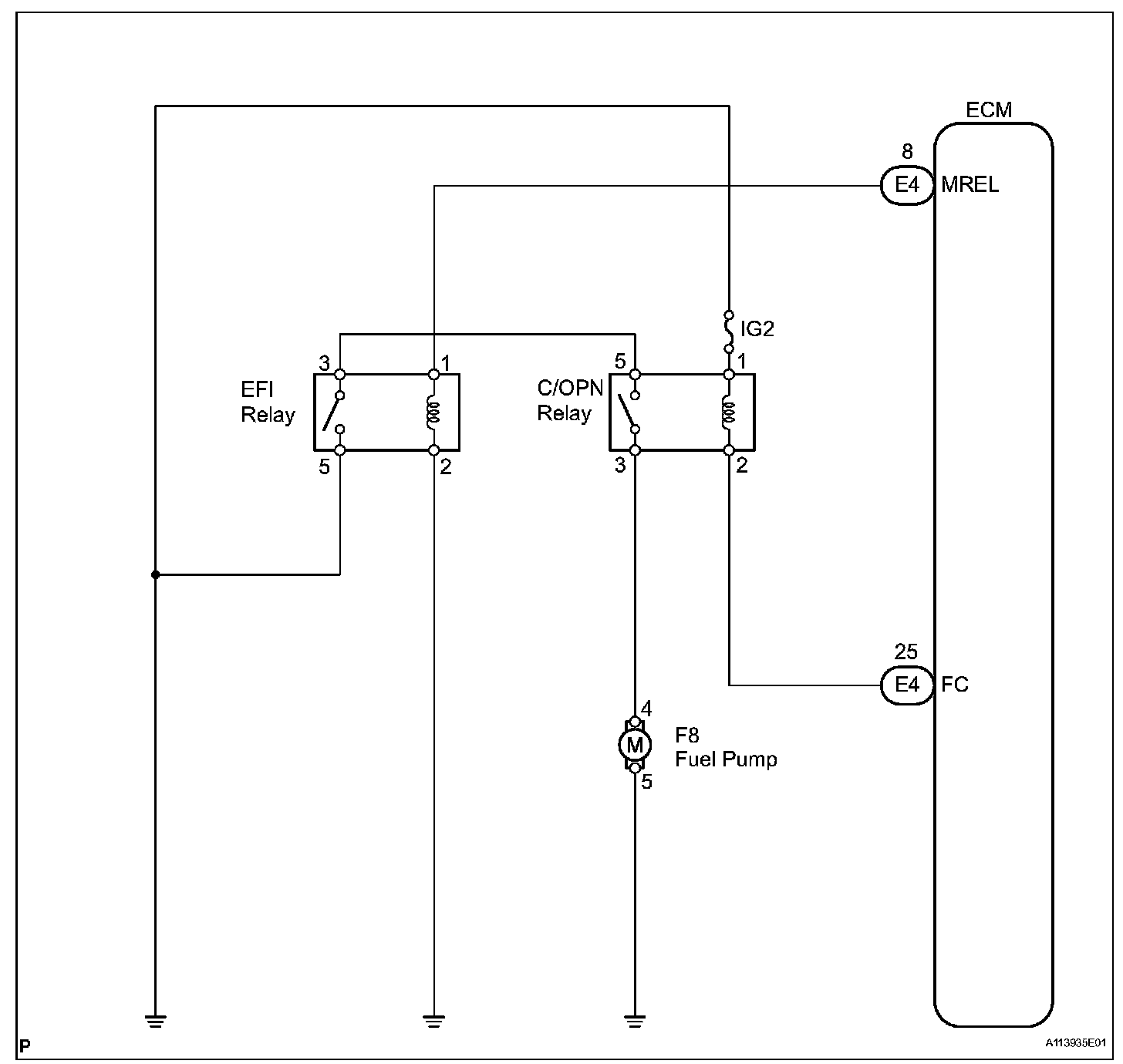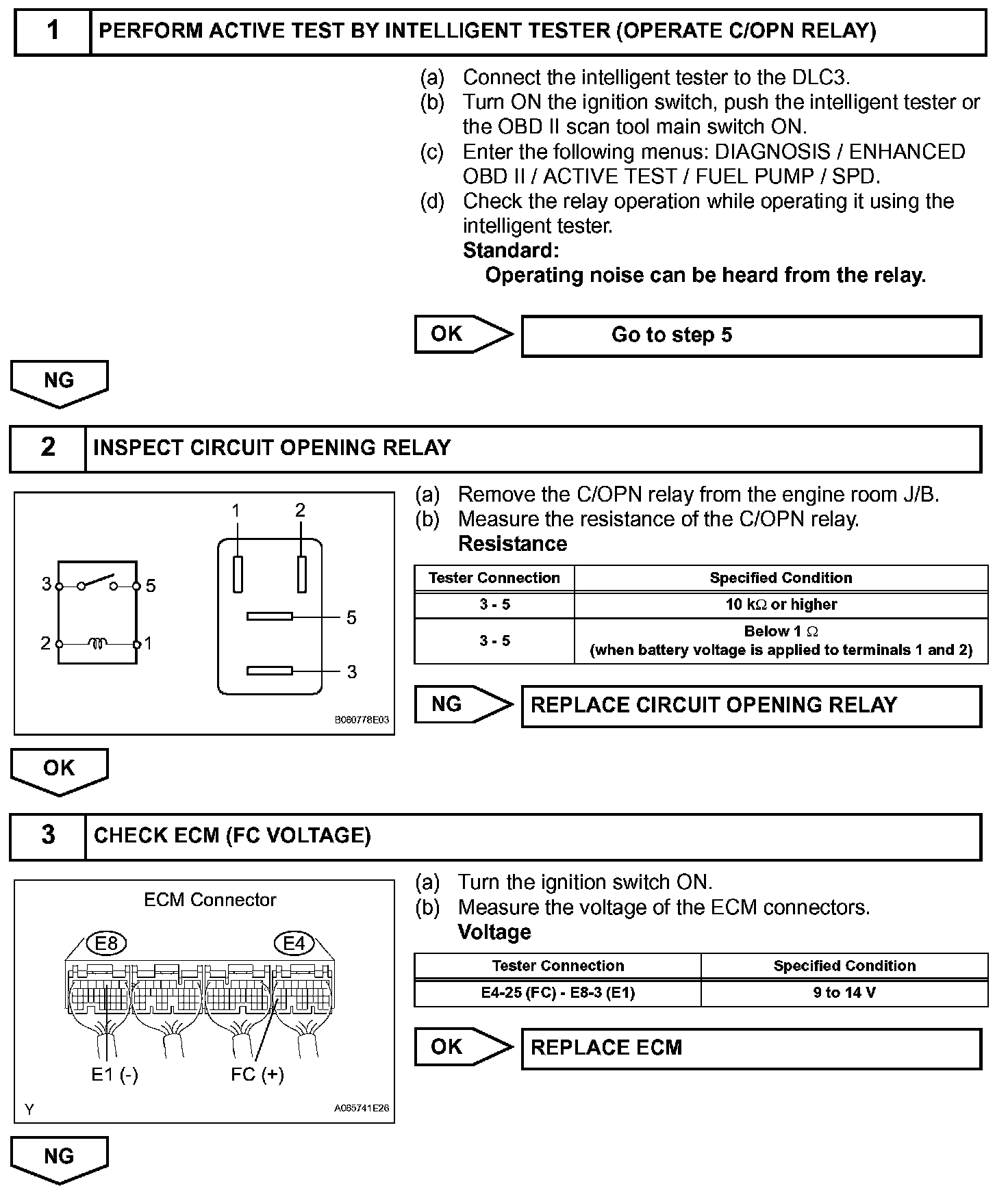 While the NE signal is generated and the engine is running, the ECM keeps Tr ON (C/OPN relay ON) and the fuel pump also keeps operating.