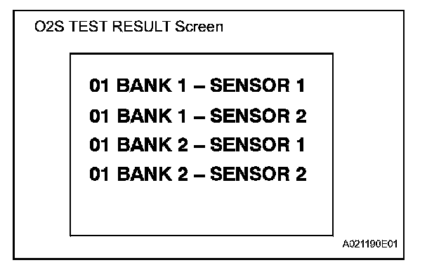 b. On the tester screen, select the following menus: DIAGNOSIS / CARB OBD II / O2S TEST RESULT. A list of the O2S equipped on the vehicle will be displayed.