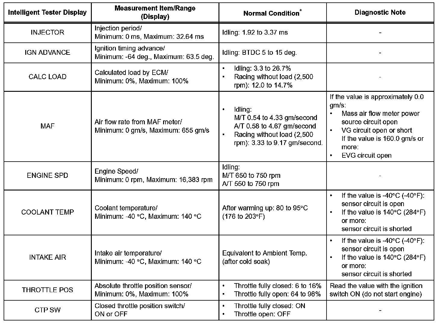 DATA LISTHINT: Using the intelligent tester's DATA LIST allows switch, sensor, actuator and other item values to be read without removing any parts. Reading the DATA LIST early in troubleshooting is one way to shorten labor time.