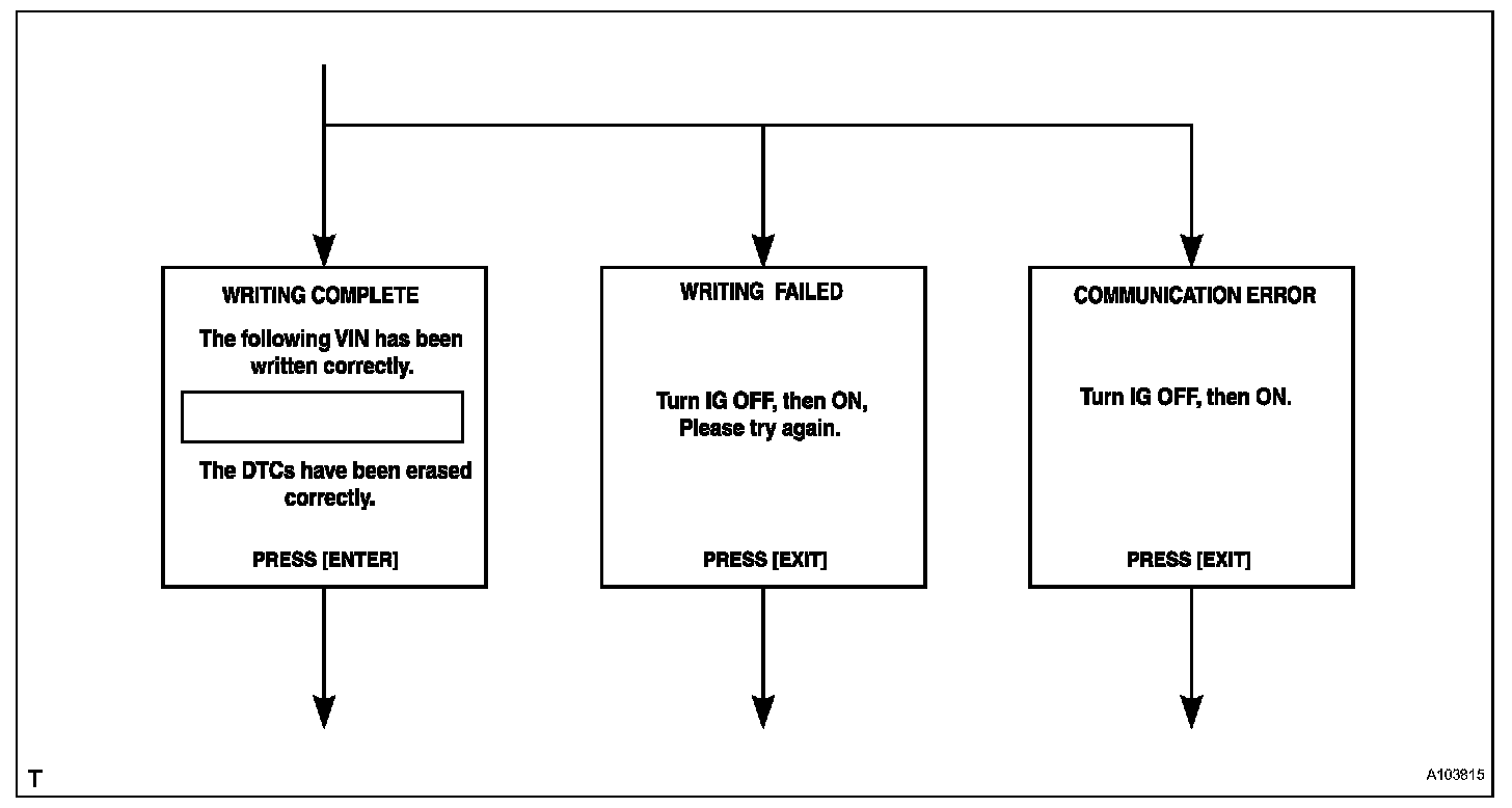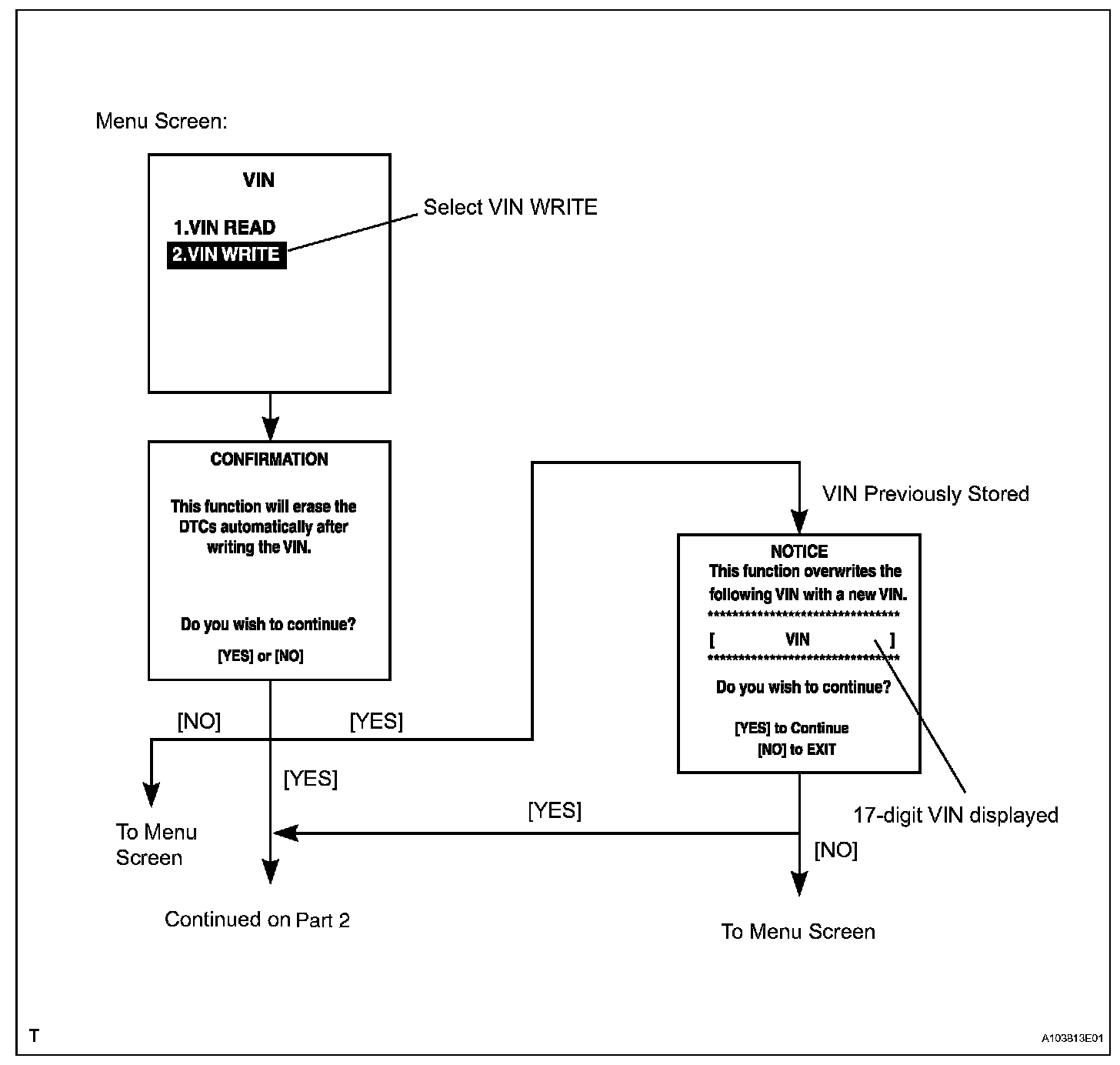 a. Explains the VIN writing process in a flowchart. This process allows the VIN to be input into the ECM. If the ECM is changed, or the ECM VIN and Vehicle VIN do not match, the VIN can be registered, or overwritten in the ECM by following this procedure.