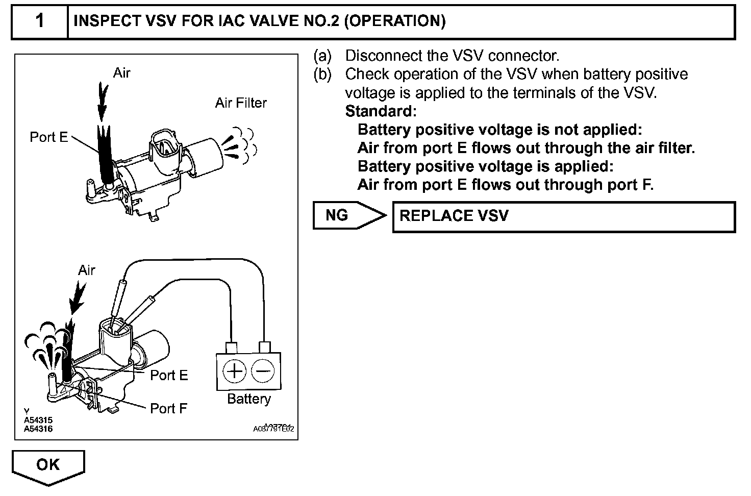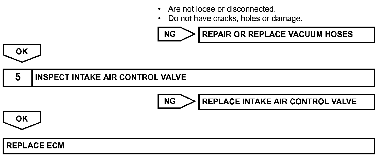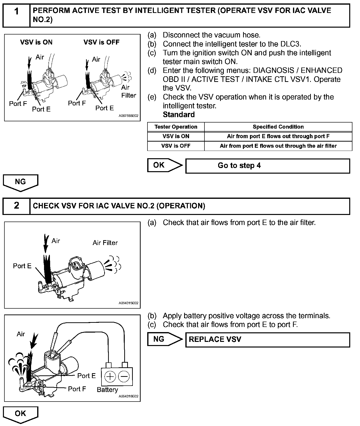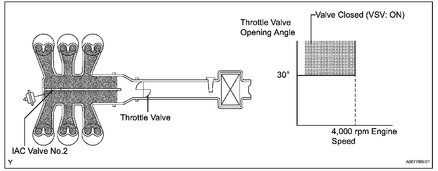 The ECM opens and closes the Intake Air Control (IAC) valve No.2 in response to engine speed (RPM/NE). This system improves intake manifold tuning for better efficiency at low and high engine rpm. When the engine speed is 4,000 rpm or less and the throttle valve opening angle is 30 degrees or more, the ECM turns the VSV ON to operate the IAC valve.