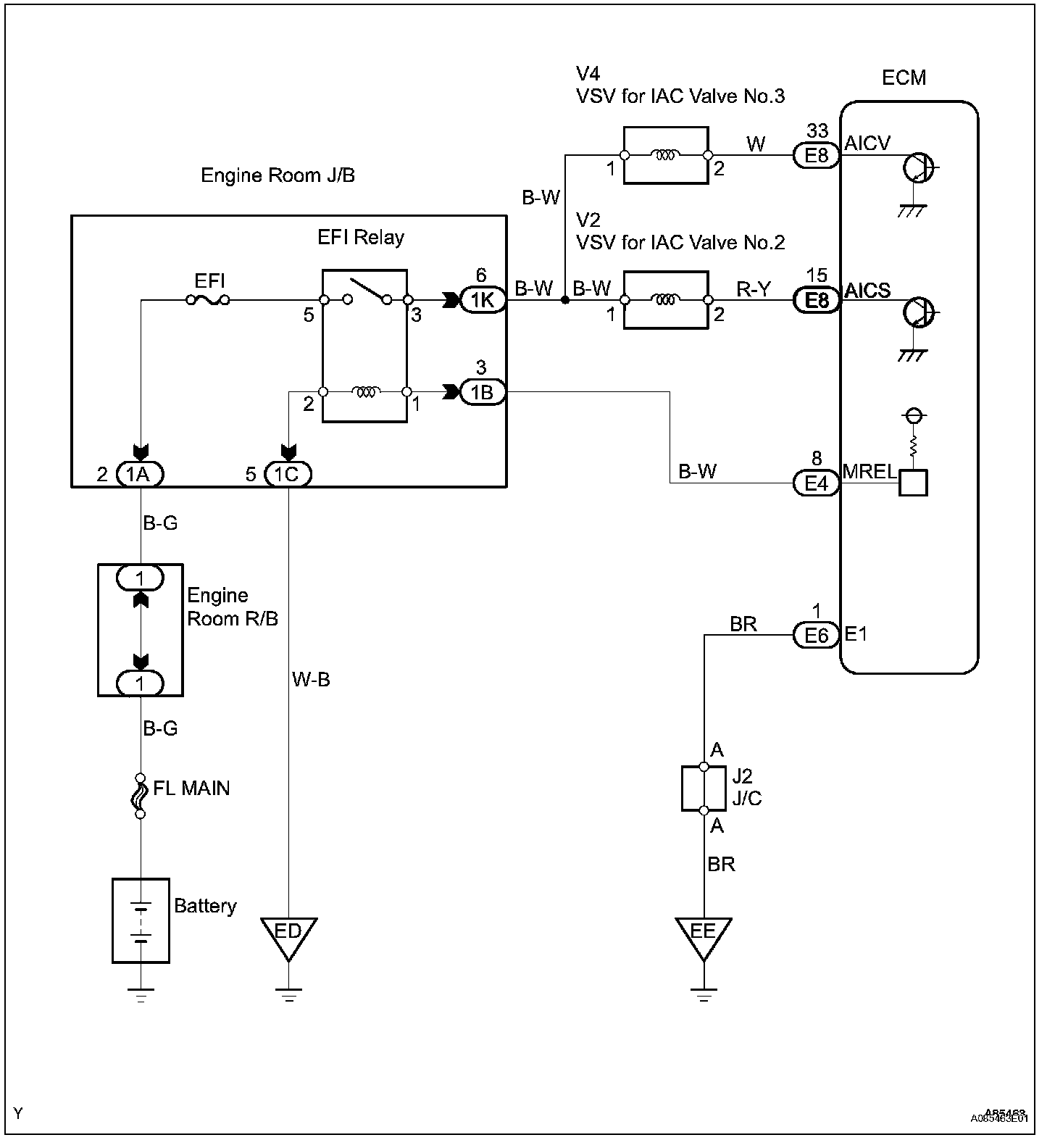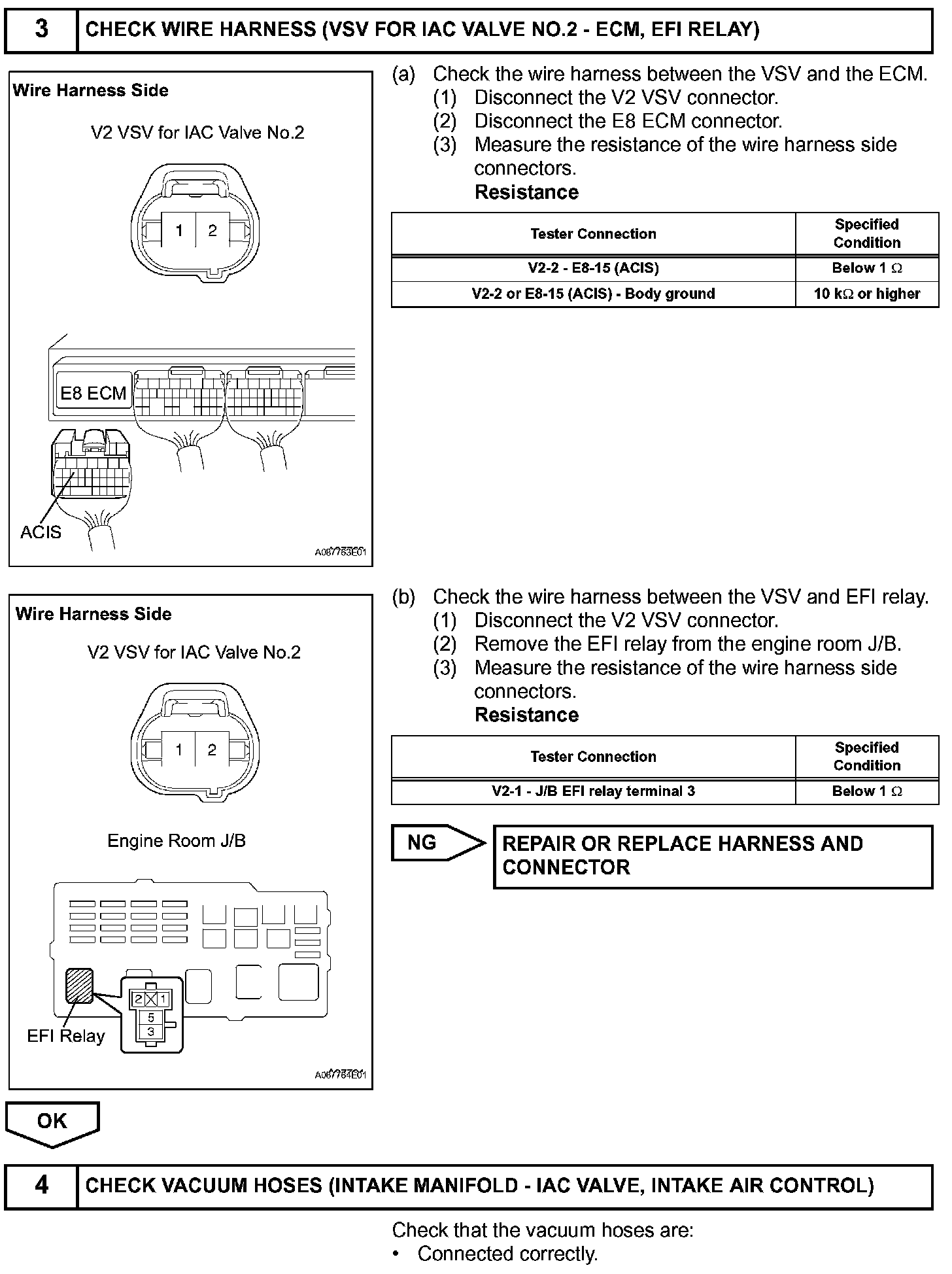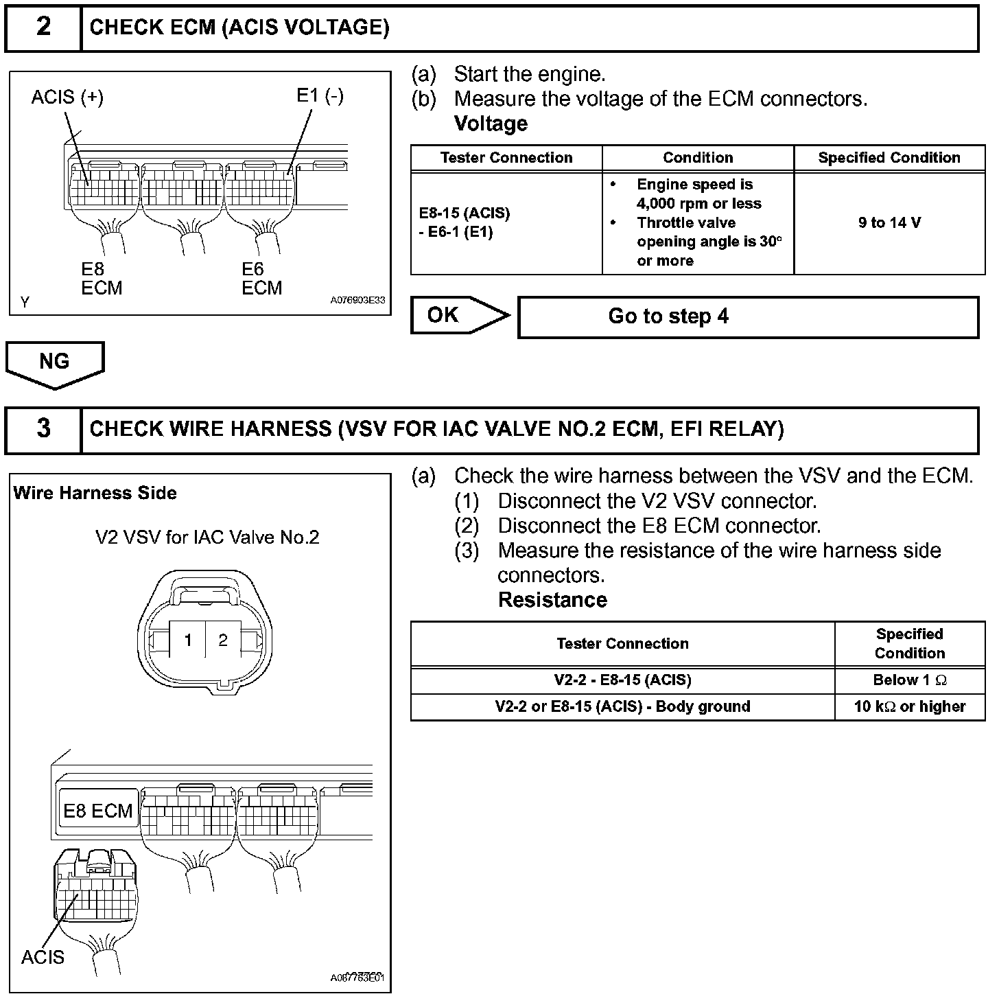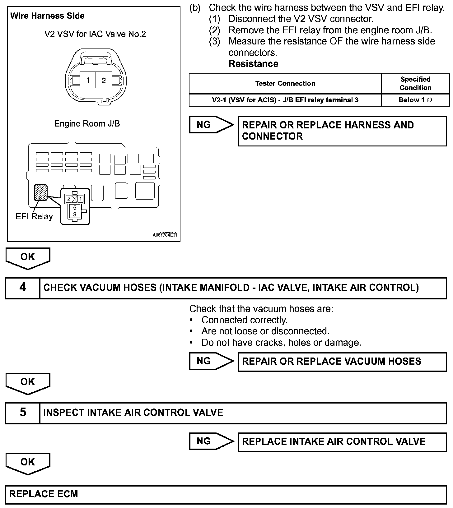 The ECM opens and closes the Intake Air Control (IAC) valve No.2 in response to engine speed (RPM/NE). This system improves intake manifold tuning for better efficiency at low and high engine rpm. When the engine speed is 4,000 rpm or less and the throttle valve opening angle is 30 degrees or more, the ECM turns the VSV ON to operate the IAC valve.