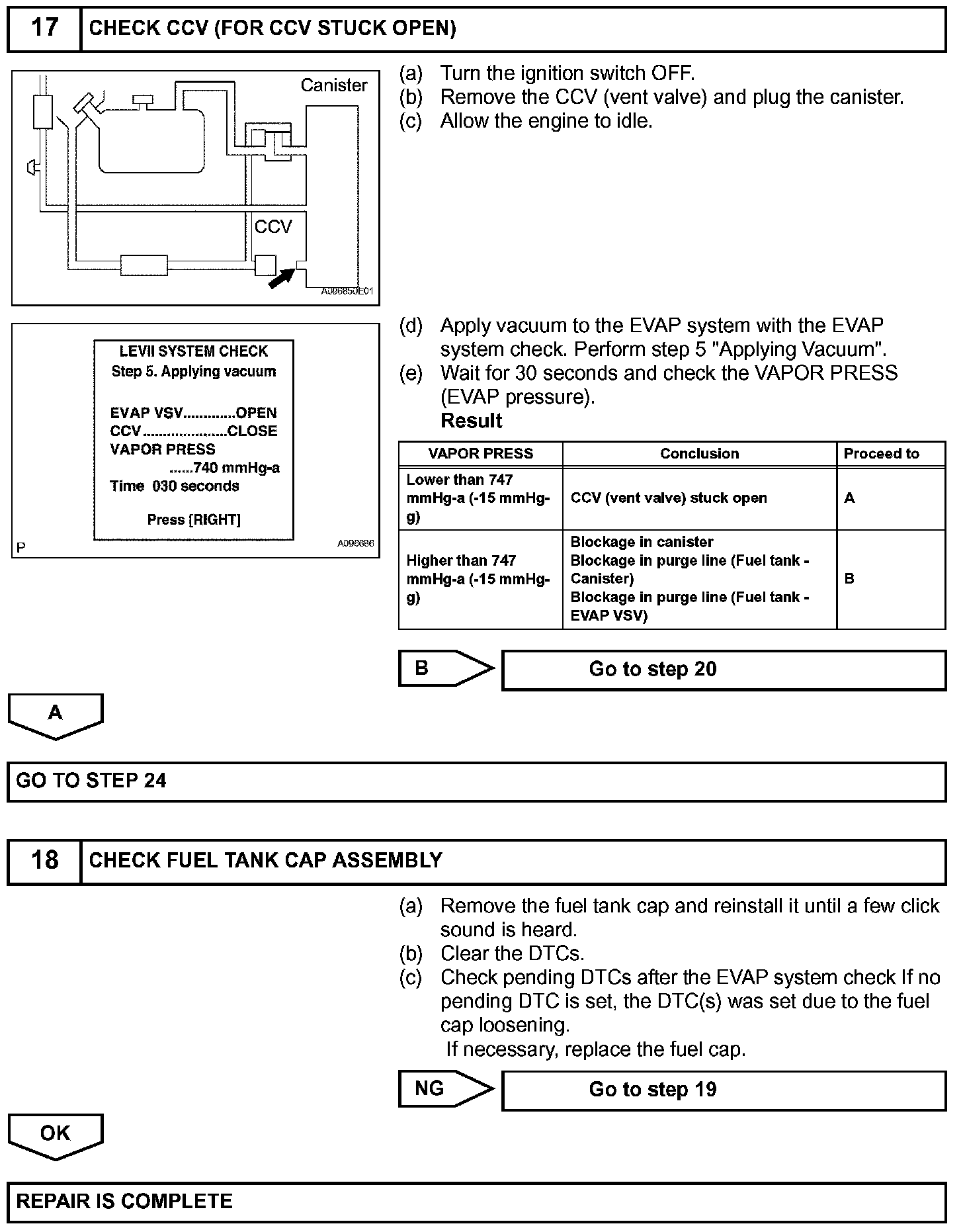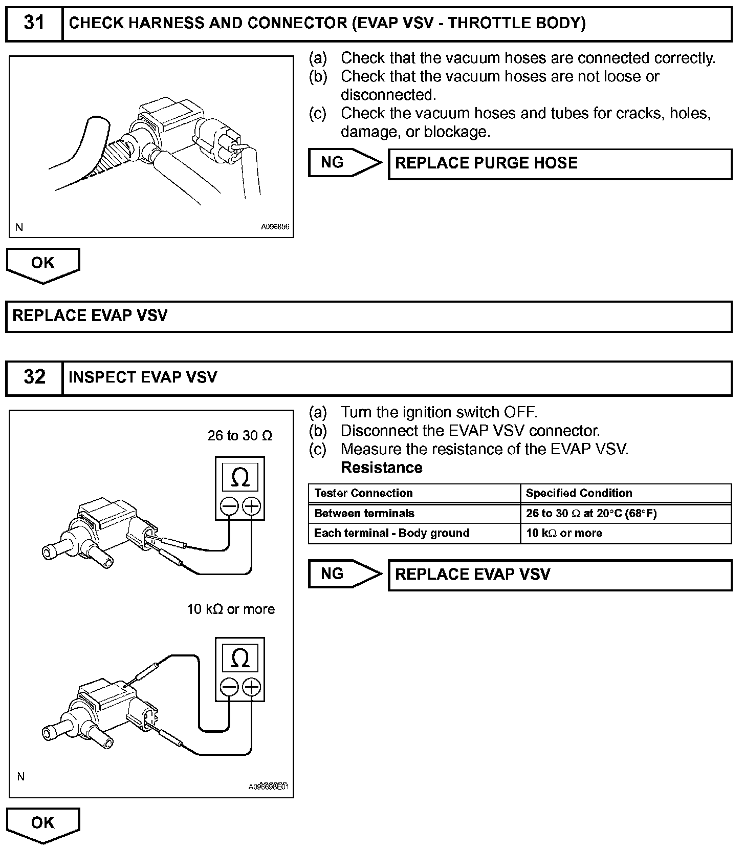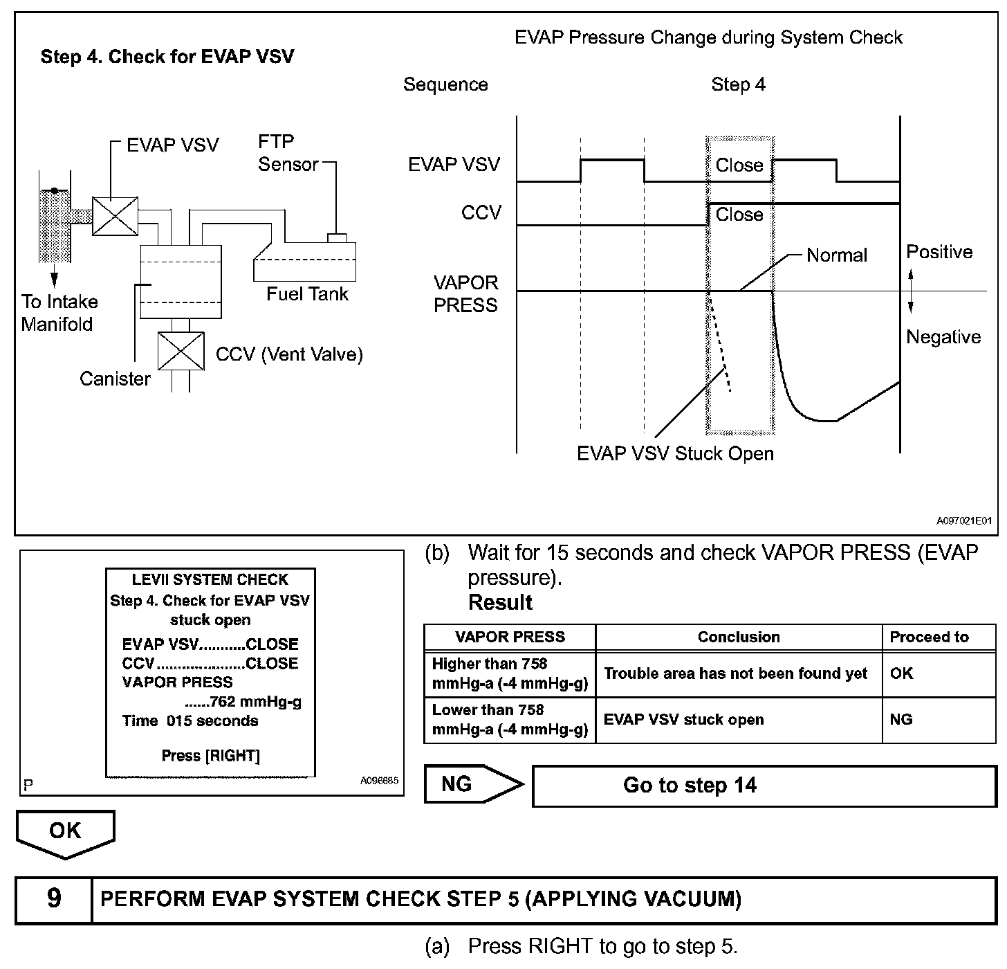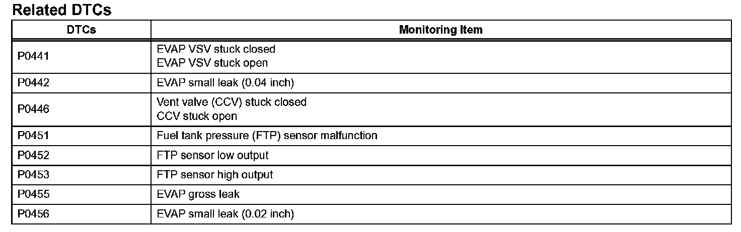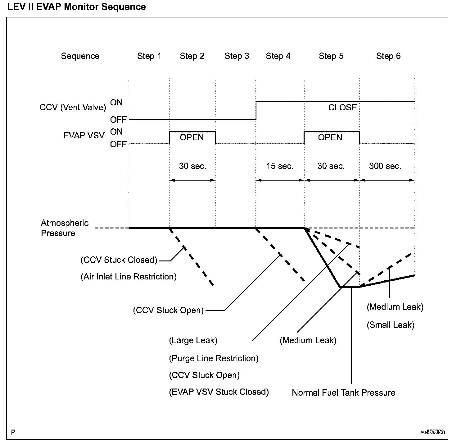 The EVAP monitor's purpose is to check for EVAP leaks and EVAP VSV and CCV malfunctions. The monitor performs the check by first introducing the intake manifold's negative pressure (vacuum) to the EVAP system. Then, the monitor records change in the EVAP system's pressure levels. The monitor runs when the following conditions are met: