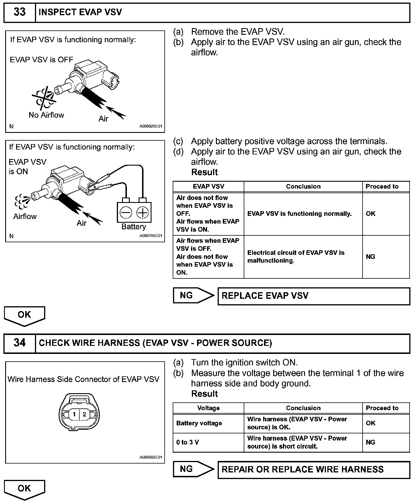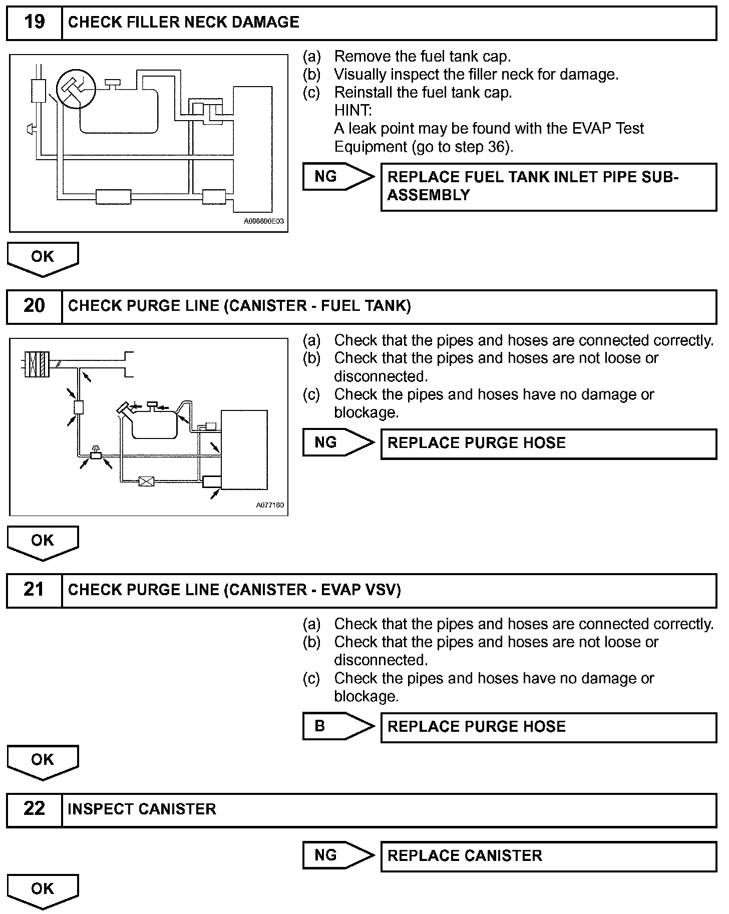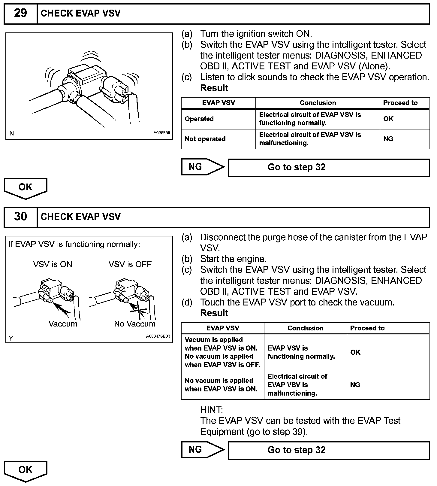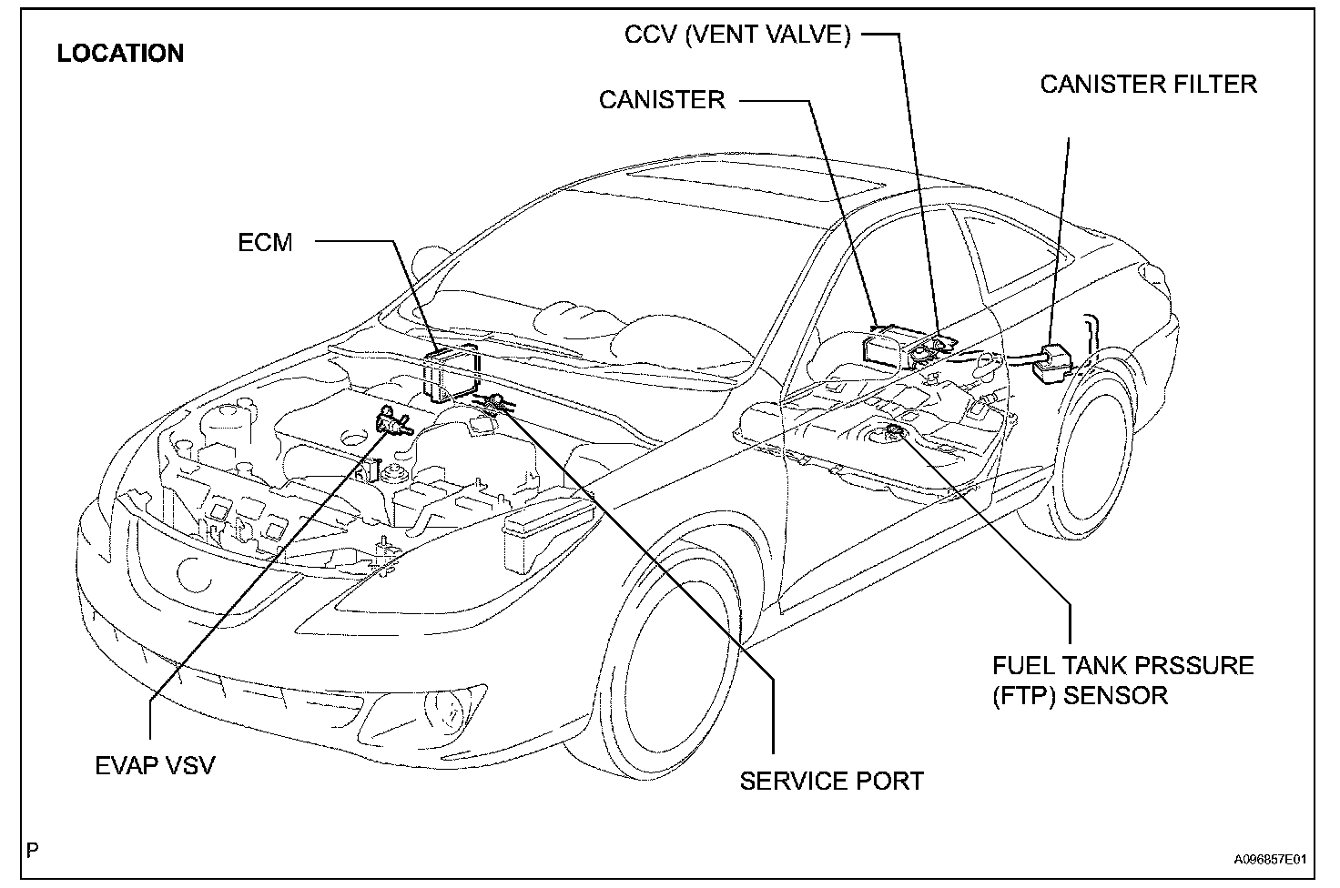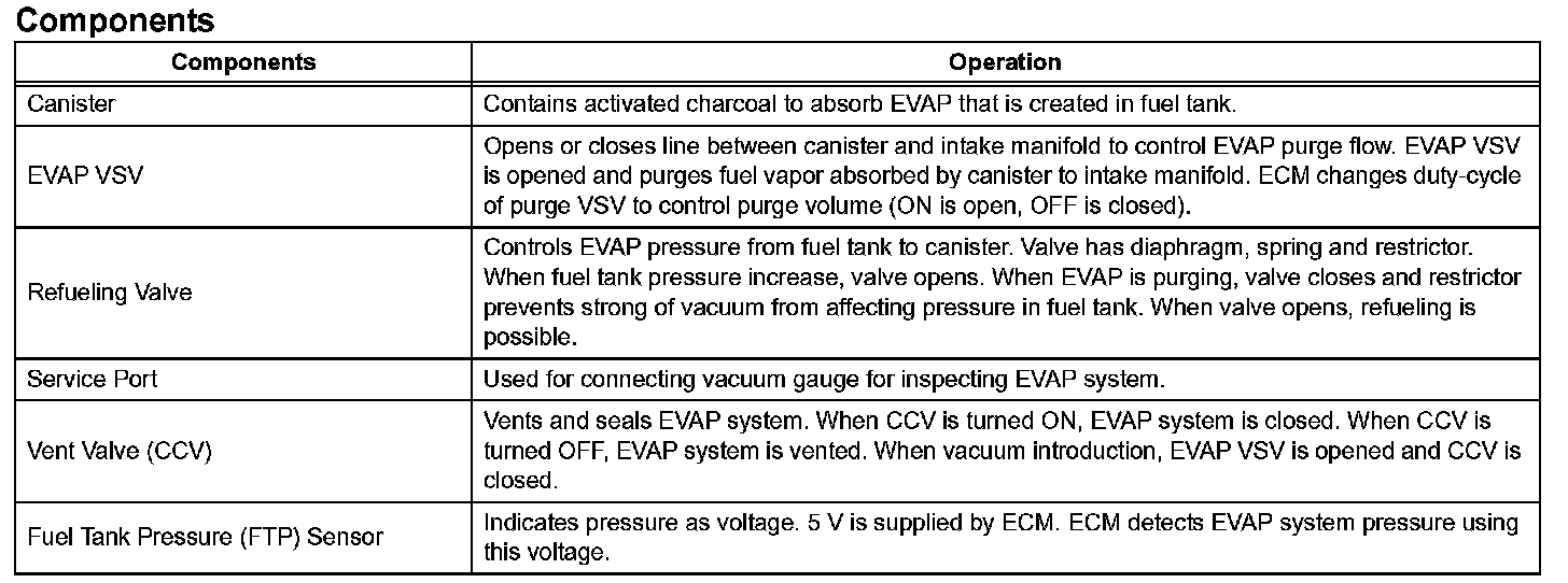 When predetermined conditions (closed loop, etc.) are met, the EVAP VSV is opened and stored fuel vapor in the canister is purged to the intake manifold. The ECM changes duty-cycle to the EVAP VSV to control purge flow volume. Purge flow volume is determined by the intake manifold pressure. Atmospheric pressure is allowed into the canister through the vent valve (CCV) to ensure that purge flow is maintained when negative pressure (vacuum) is applied to the canister. This EVAP system contains given components: