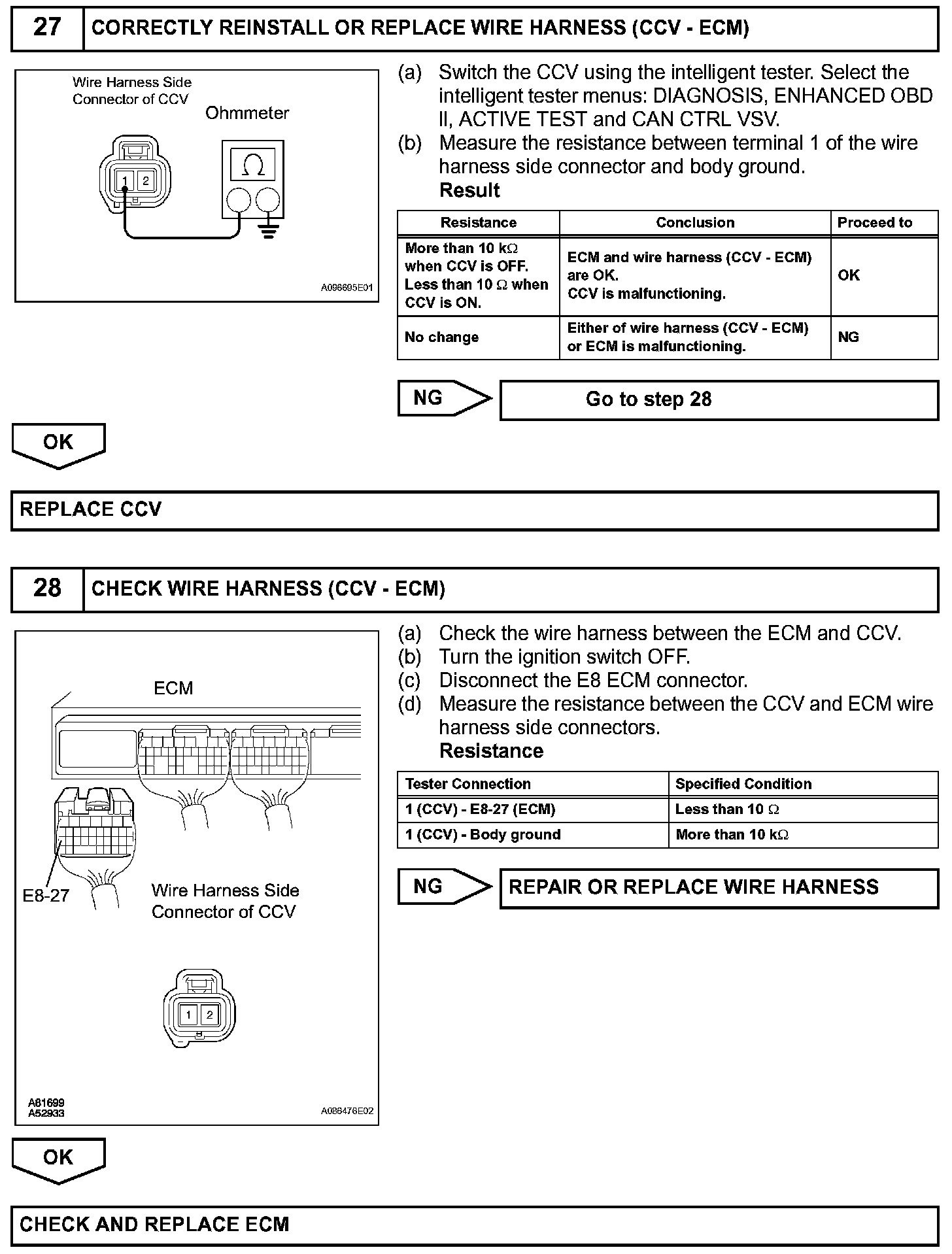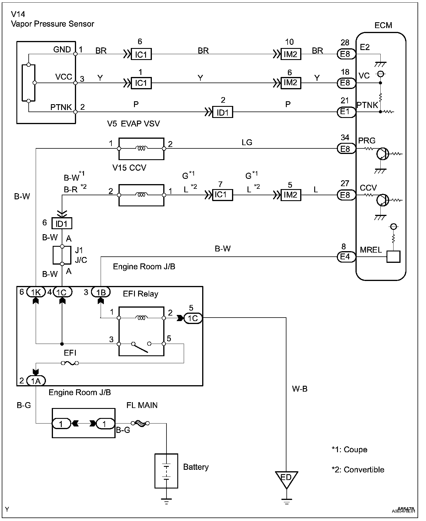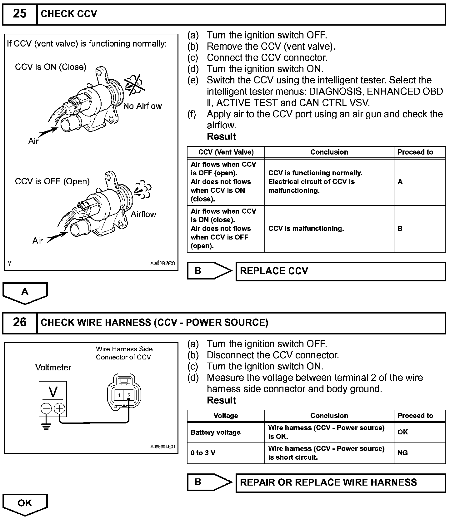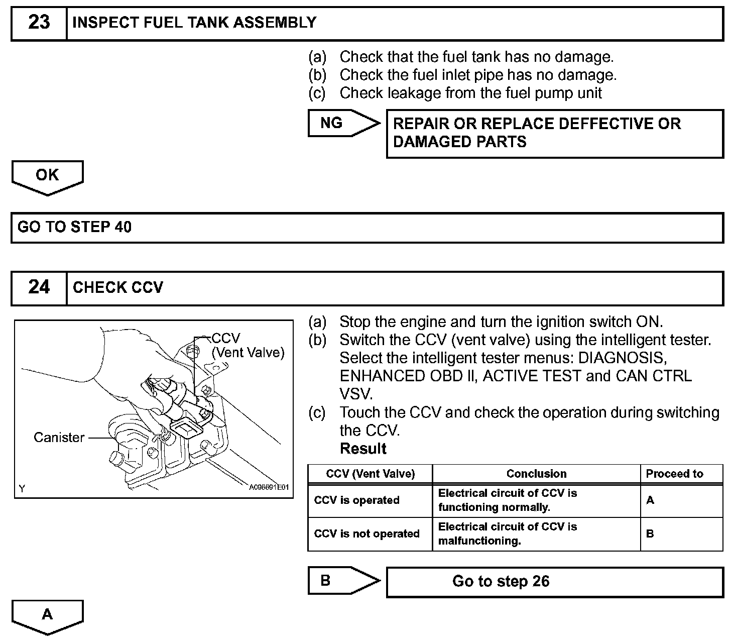 When predetermined conditions (closed loop, etc.) are met, the EVAP VSV is opened and stored fuel vapor in the canister is purged to the intake manifold. The ECM changes duty-cycle to the EVAP VSV to control purge flow volume. Purge flow volume is determined by the intake manifold pressure. Atmospheric pressure is allowed into the canister through the vent valve (CCV) to ensure that purge flow is maintained when negative pressure (vacuum) is applied to the canister. This EVAP system contains given components: