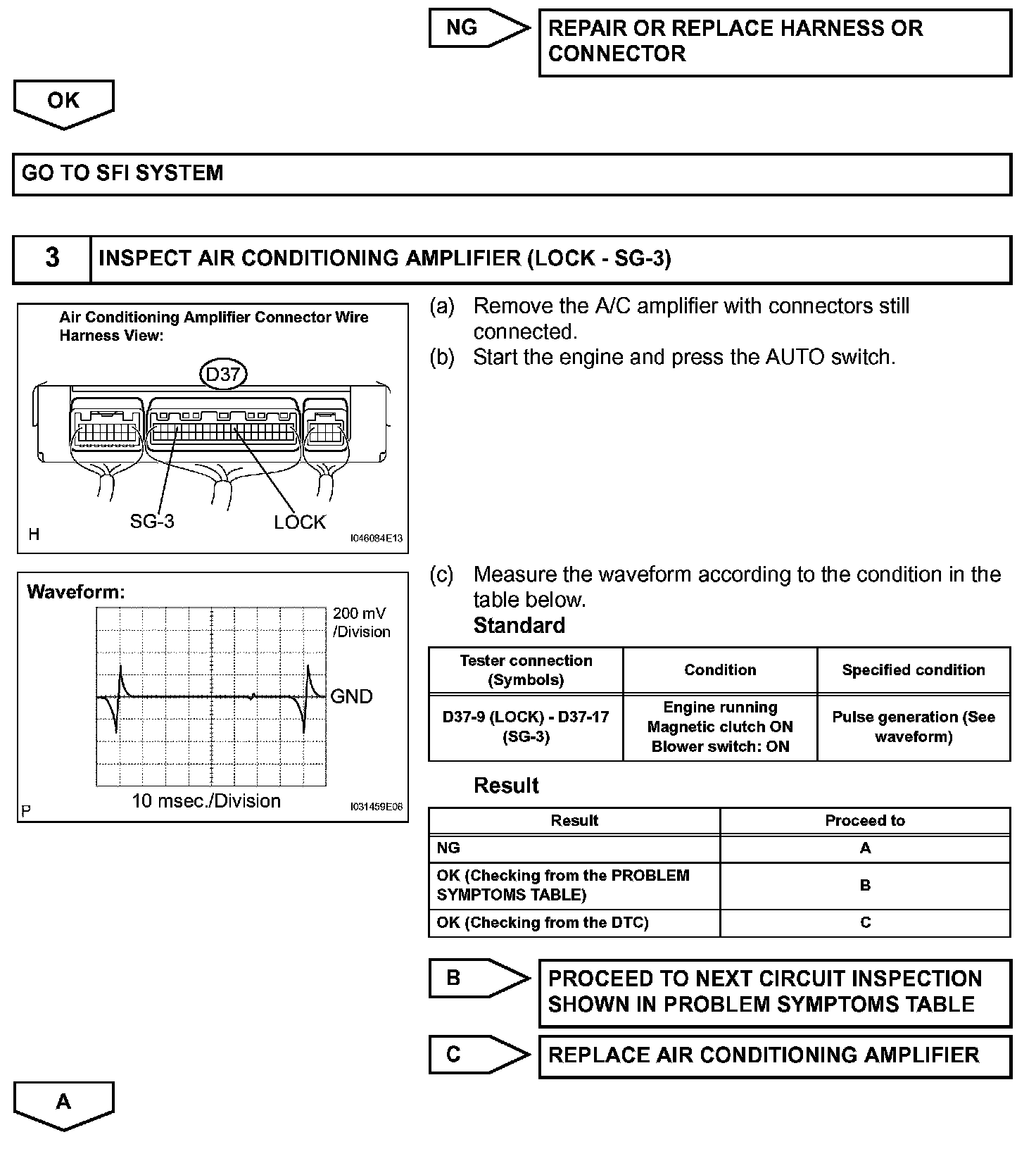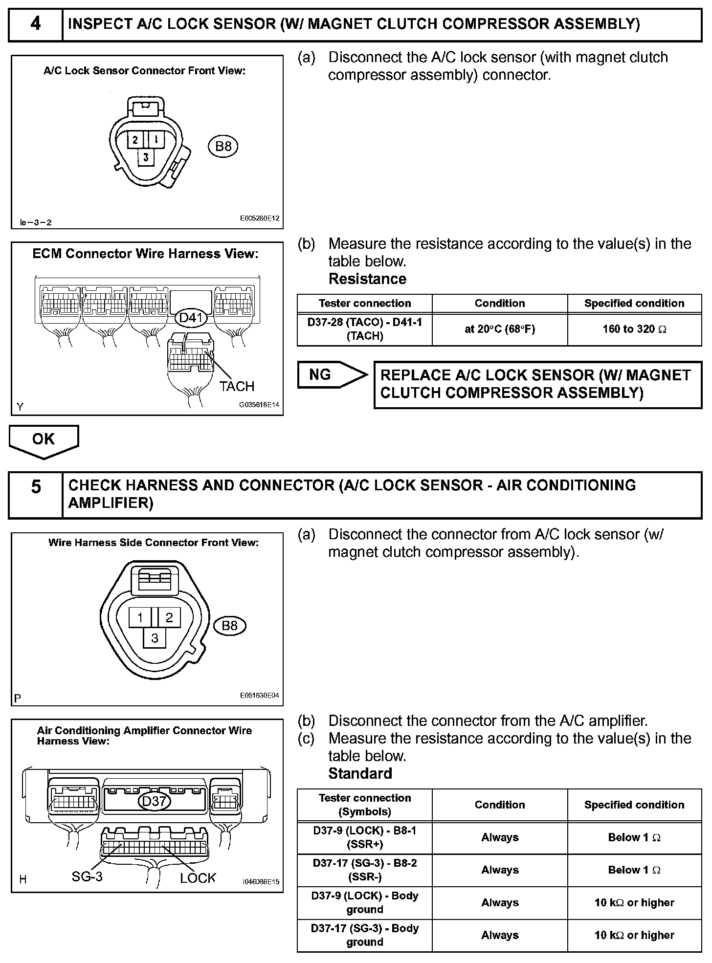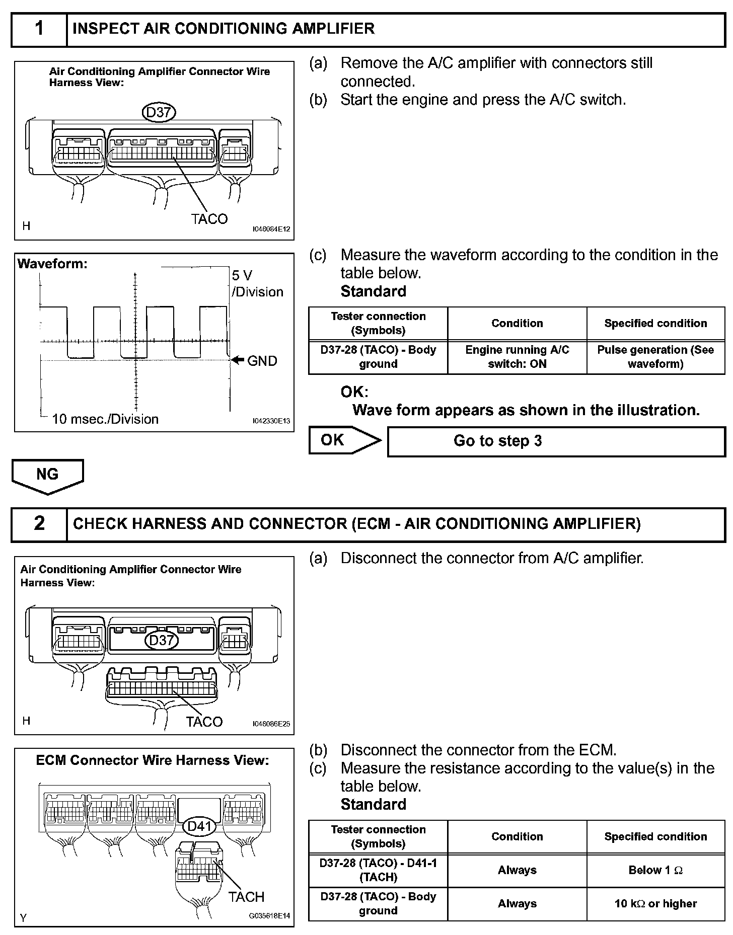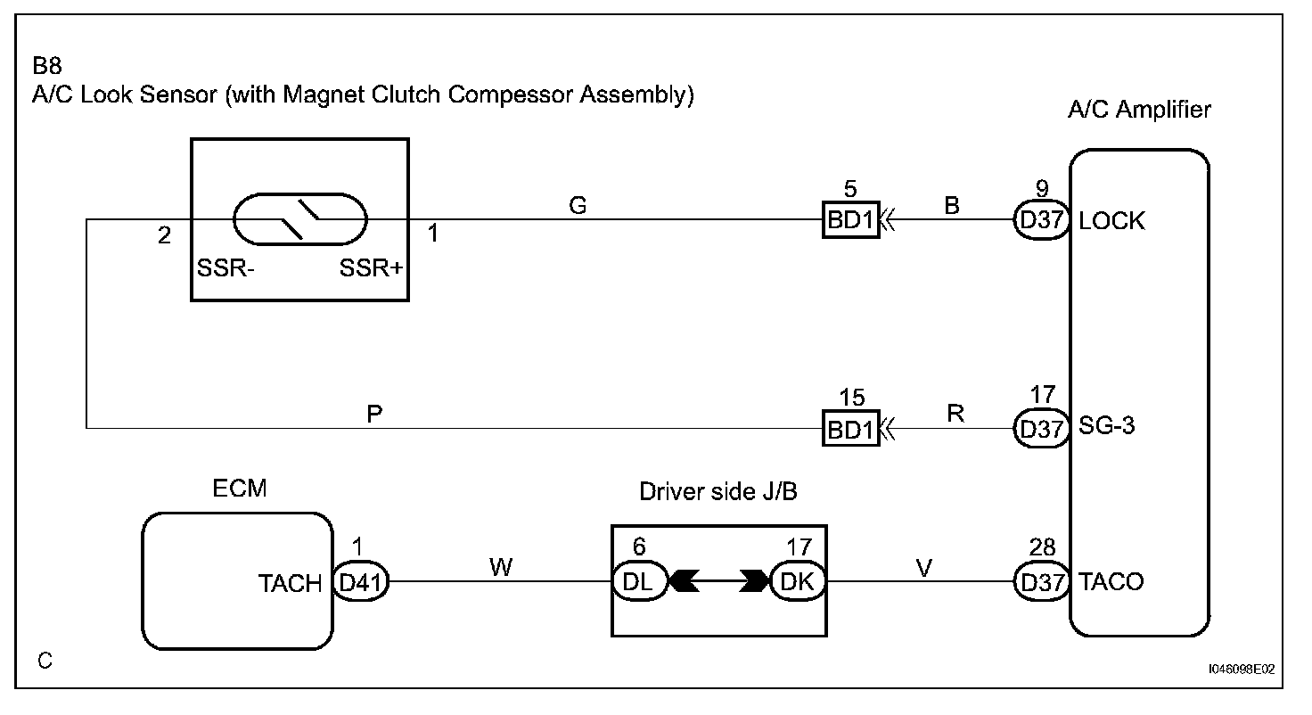 The ECM sends the engine speed signal to the TACO terminal of the A/C amplifier. The A/C amplifier reads the difference between compressor speed and engine speed. When the difference becomes too big, the A/C amplifier determines that the compressor locks, and turns the magnetic clutch off.