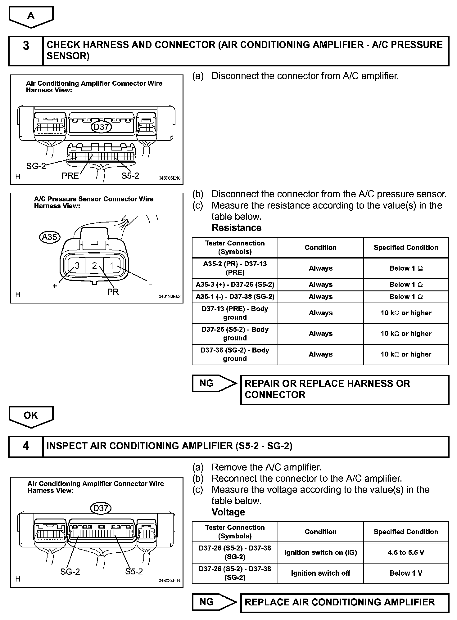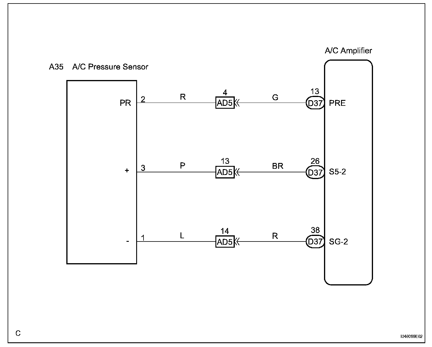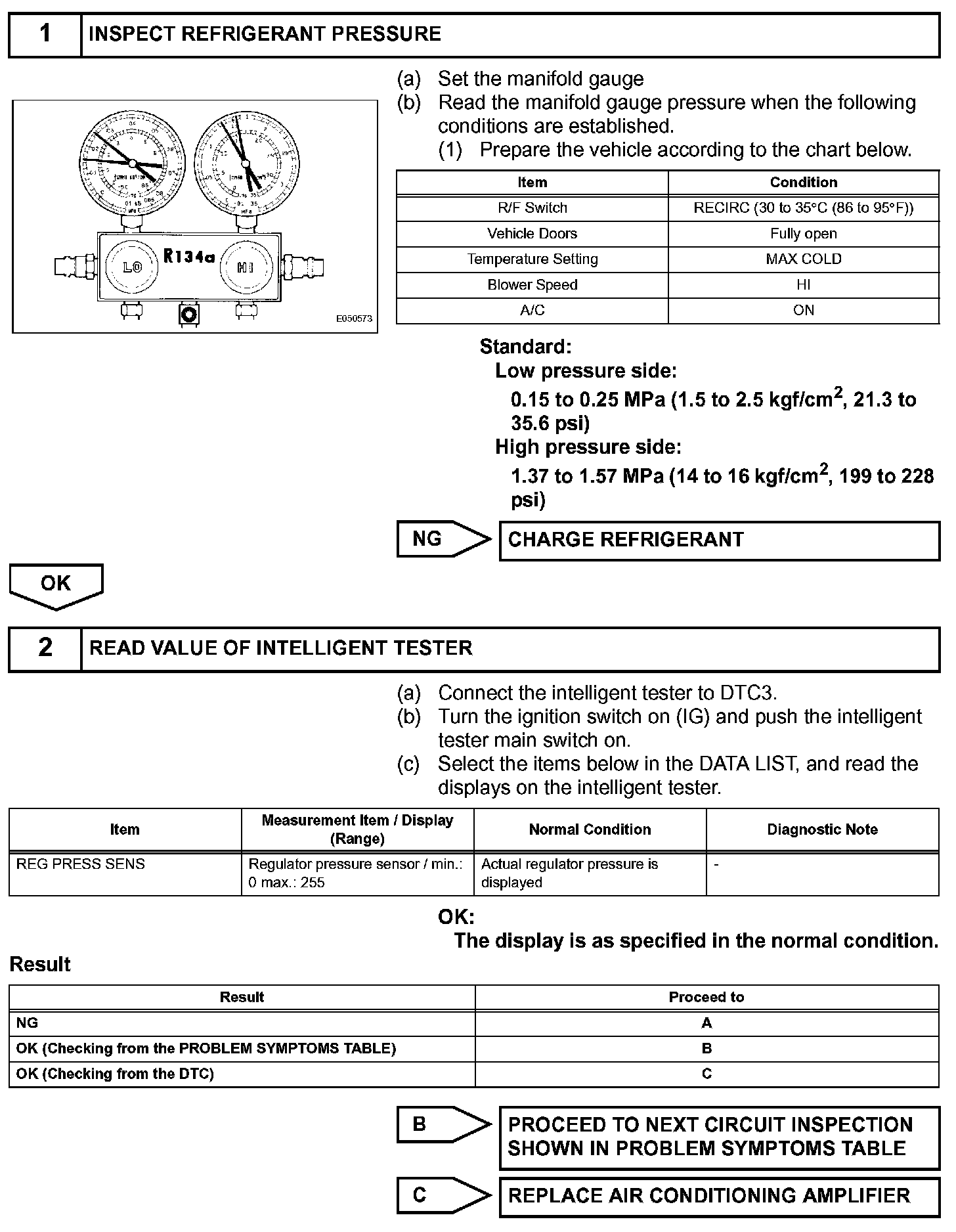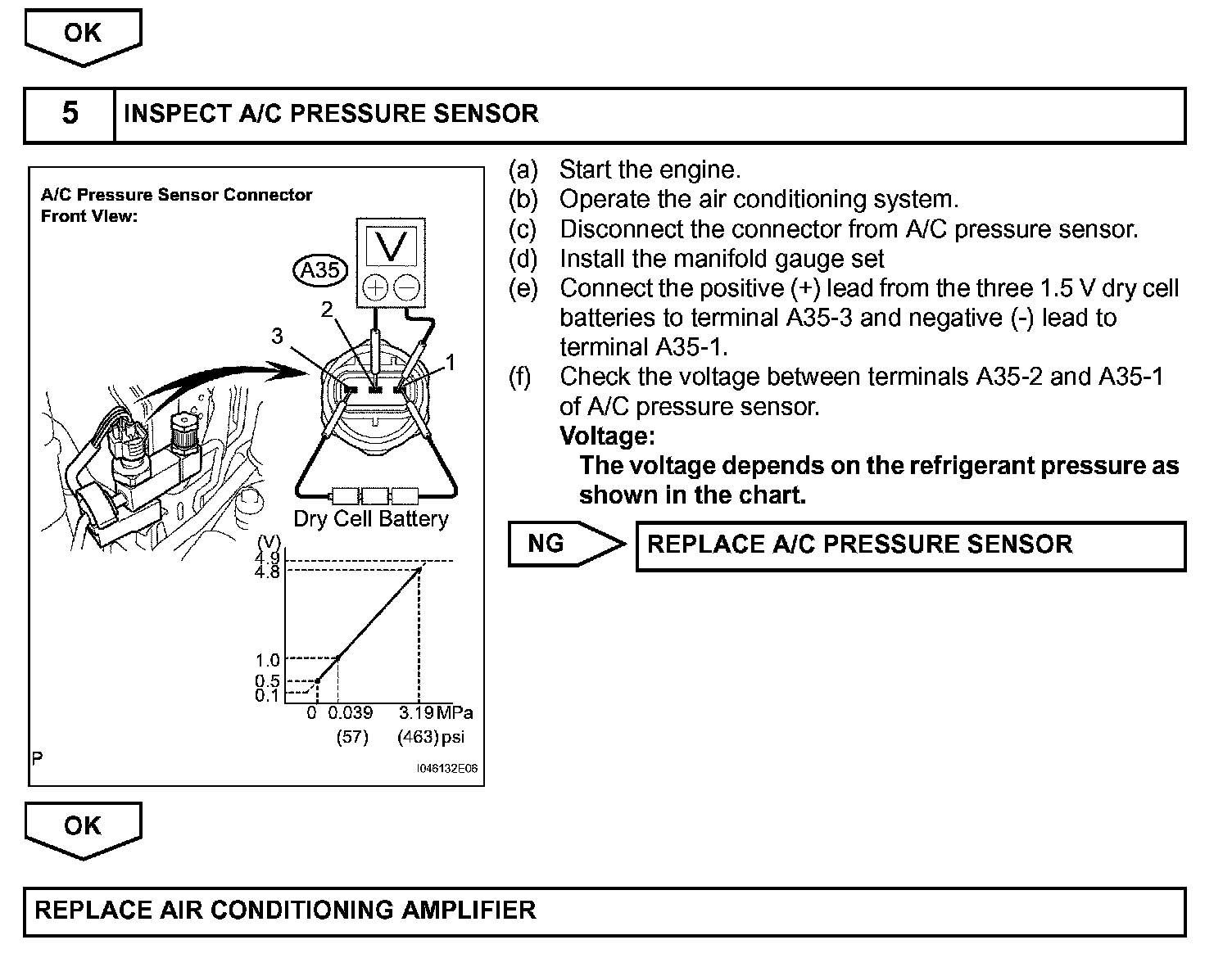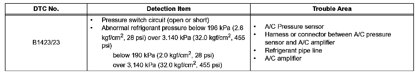 This DTC is output when refrigerant pressure is extremely low (0.19 MPa (2.0 kgf/sq.cm, 28 psi) or less) or extremely high (3.14 MPa (32.0 kgf/sq.cm, 455 psi) or more). The pressure sensor, which is installed on the pipe of the high pressure side to detect refrigerant pressure, outputs the refrigerant pressure signal to the air conditioning amplifier. The air conditioning amplifier converts the signals into pressure according to the sensor characteristics to control the compressor.