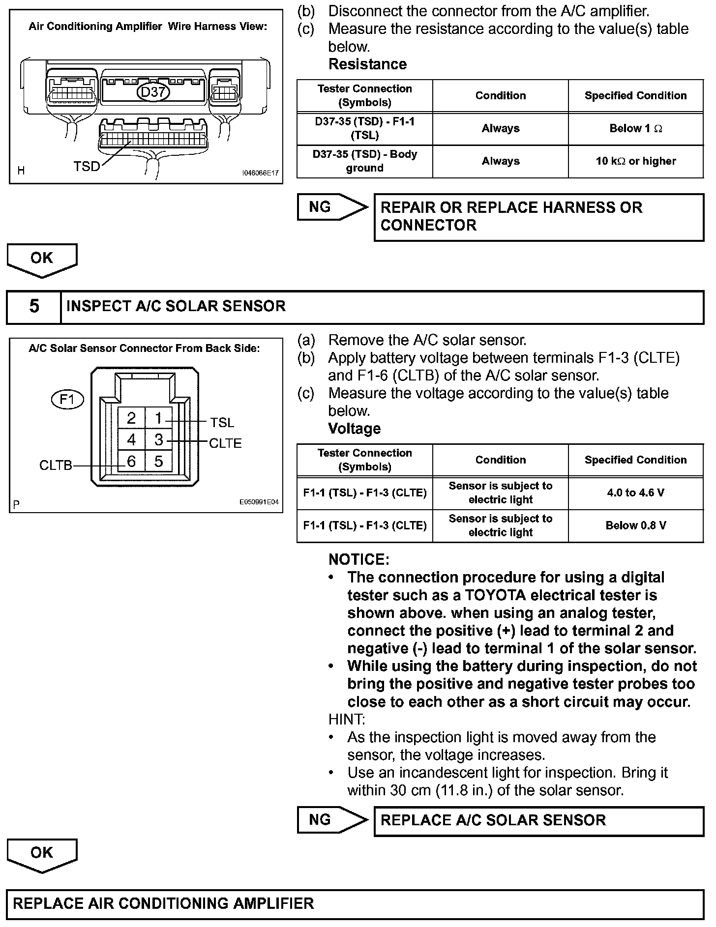 The solar sensor is installed on the upper part of the instrument panel. The solar sensor detects the amount of solar radiation and controls the "AUTO" function of the air conditioner. The out put voltage of the solar sensor changes according to the amount decreases, the voltage increases. The air conditioning amplifier reads the output voltage from the solar sensor.