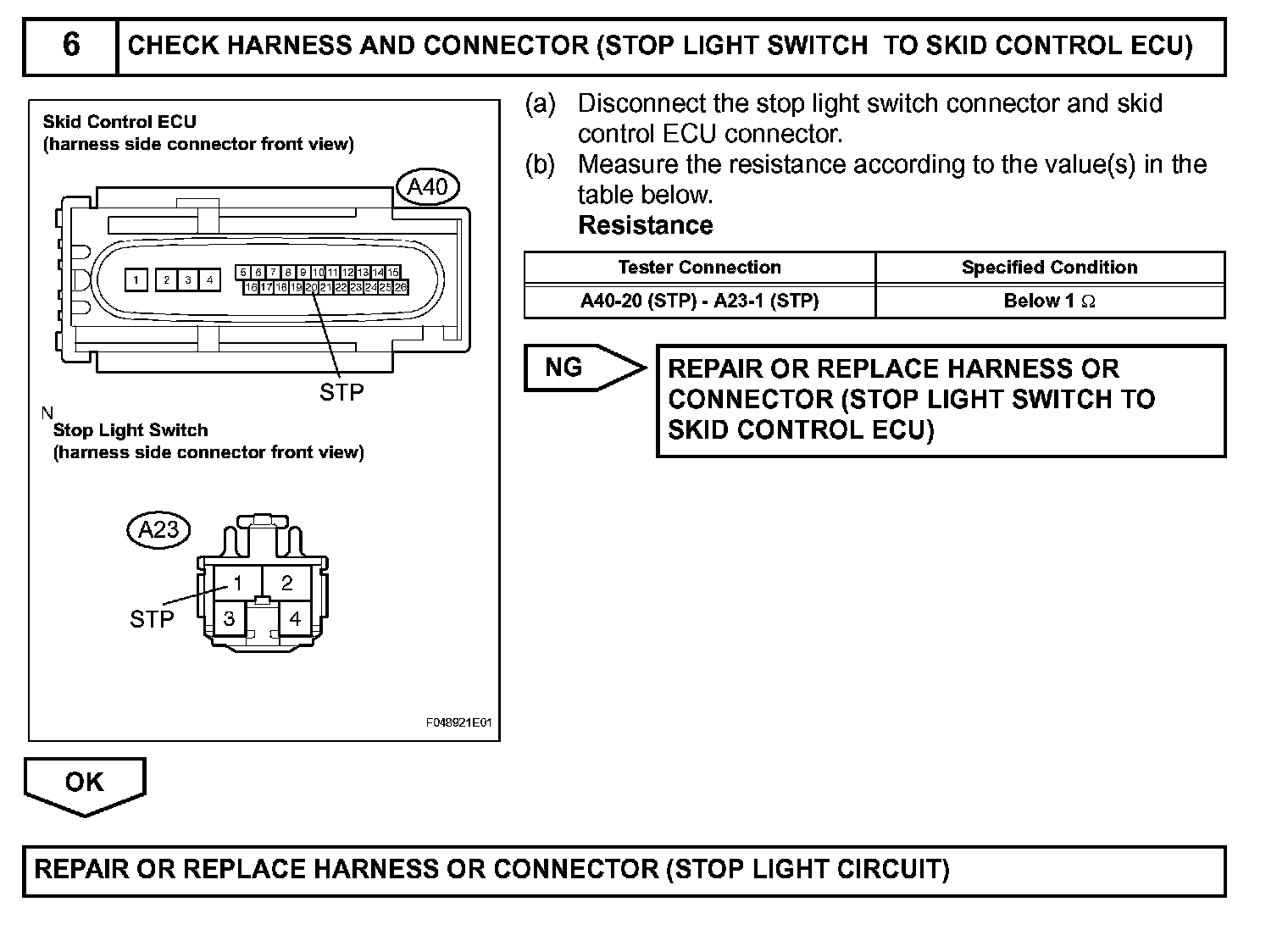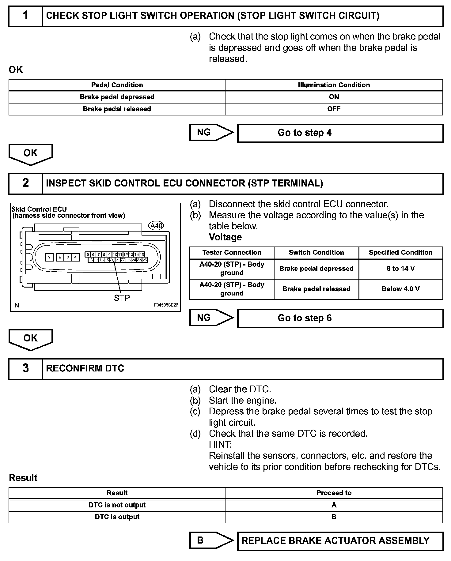 The skid control ECU has an open detection circuit, which outputs this DTC when detecting an open in the stop light signal input line (STP terminal) or the ground line of the stop light circuit with the stop light switch OFF (brake pedal not depressed).