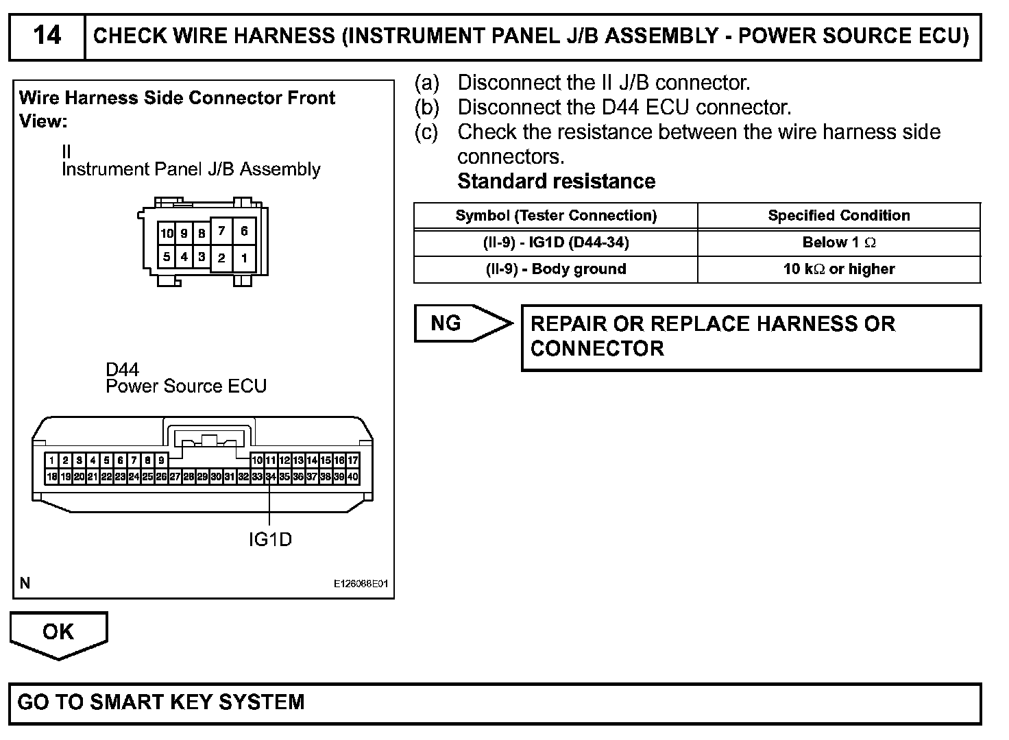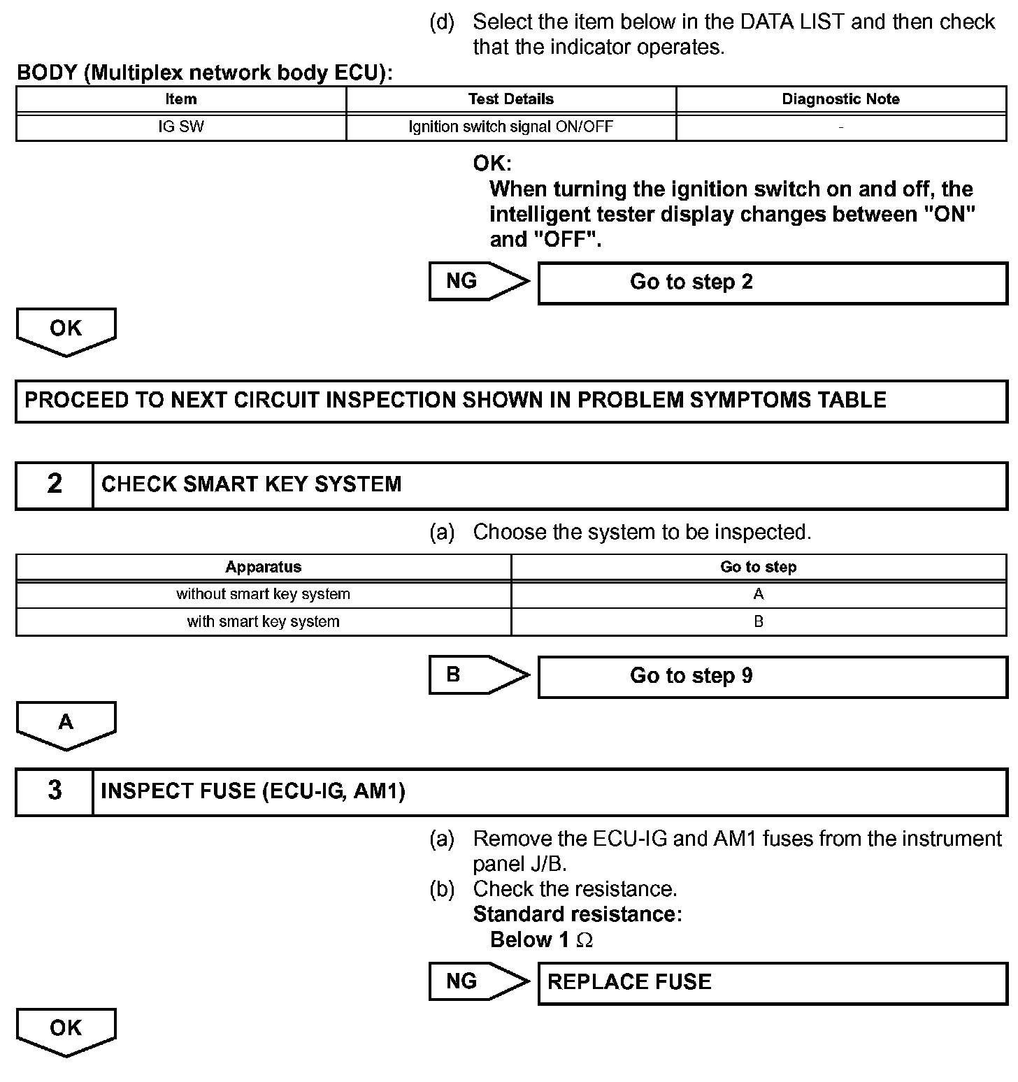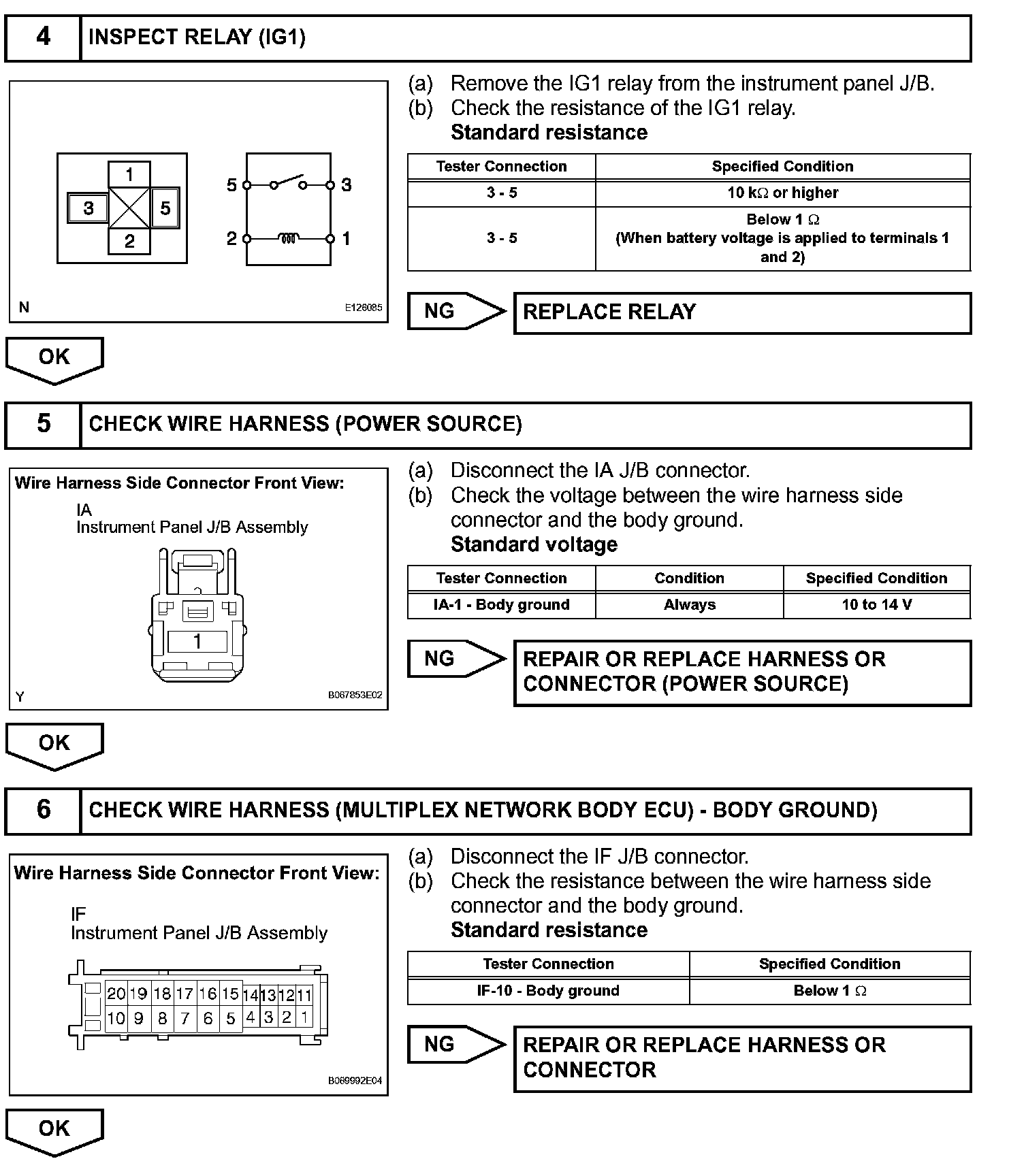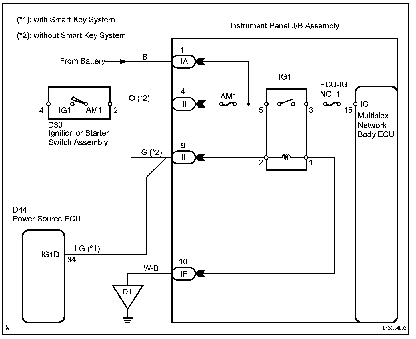 When the ignition switch is on (IG) position, battery positive voltage is applied to terminal IG of the multiplex network body ECU.