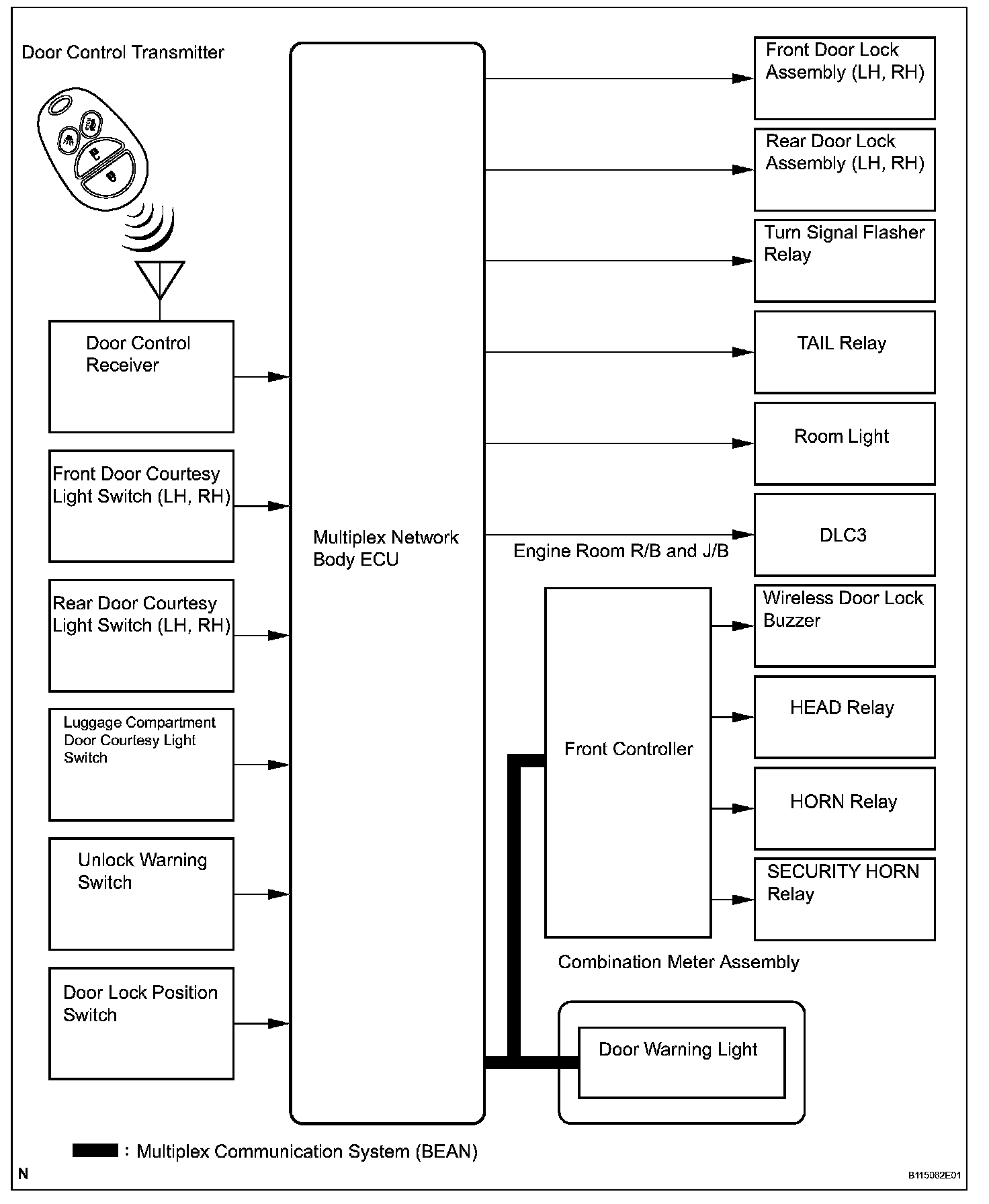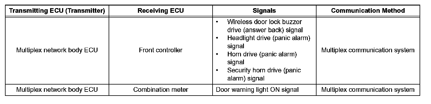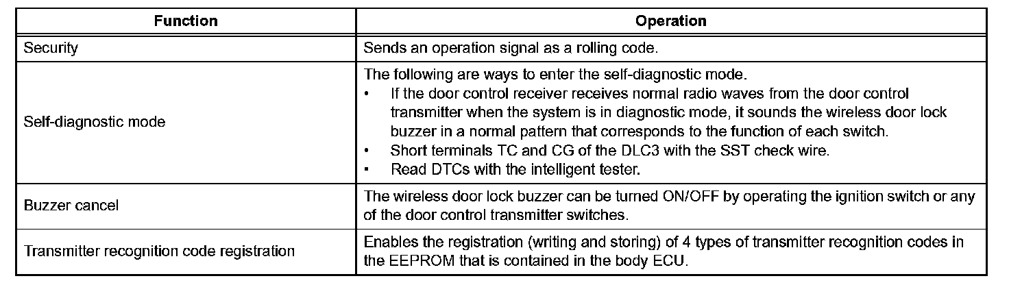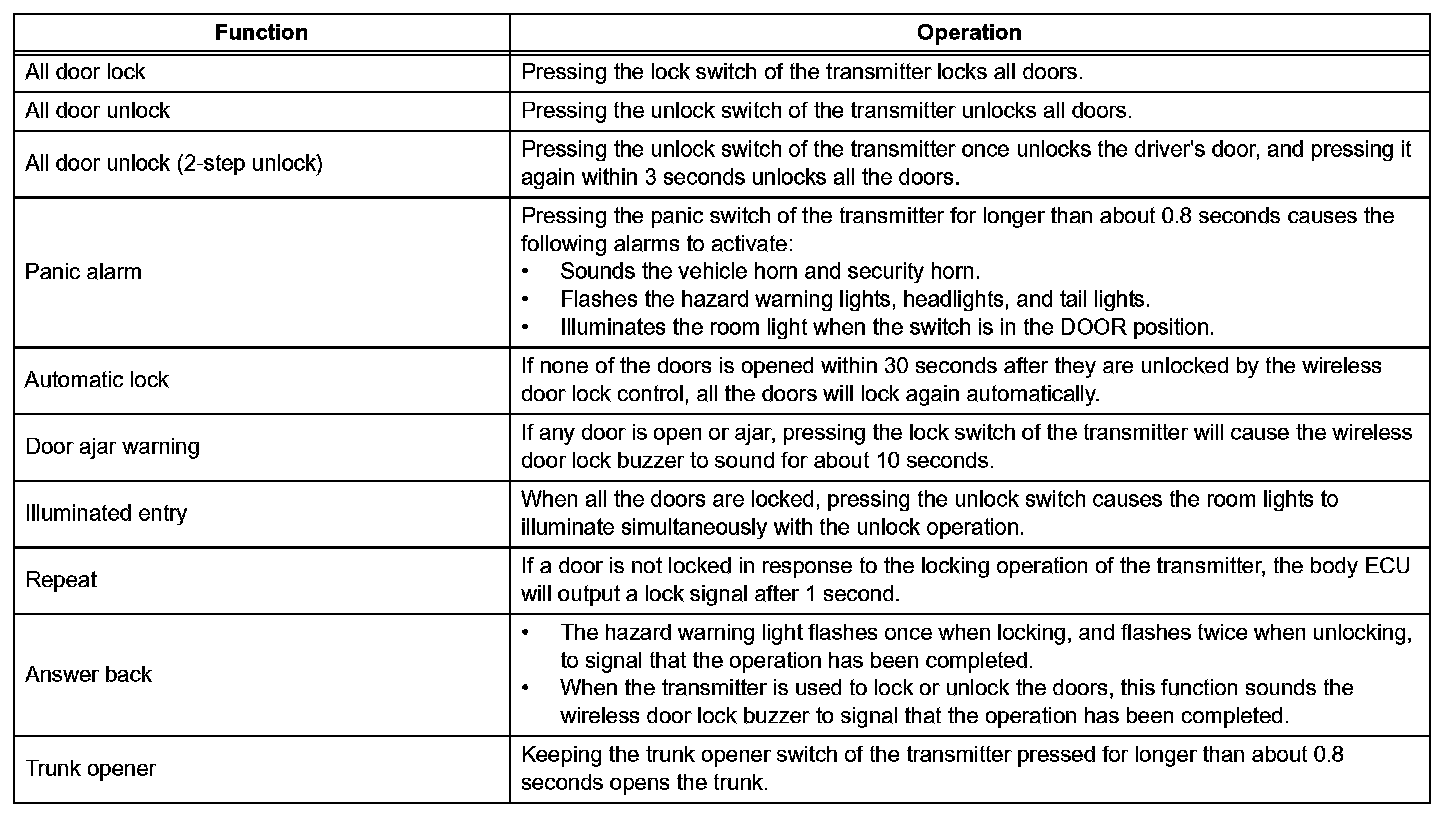 a. The wireless door lock control system functions to lock and unlock all the doors from a distance. The system is controlled by an intelligent transmitter which sends radio waves to the door control receiver. The multiplex network body ECU performs an ID code identification process and engages the door lock control.