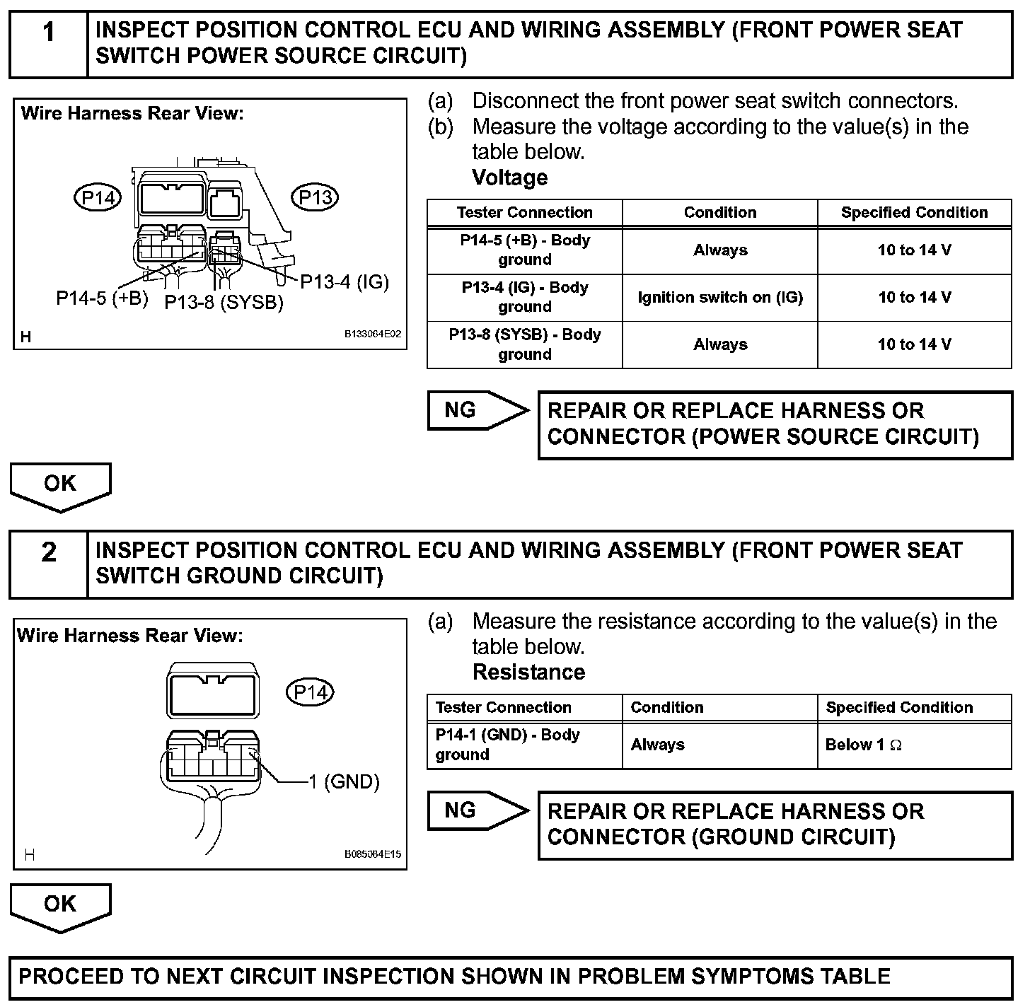 Manual adjustment of the slide, reclining, or lumbar can be performed even when the front power seat switch is not functional if current is allowed to flow into terminals +B and SYSB.