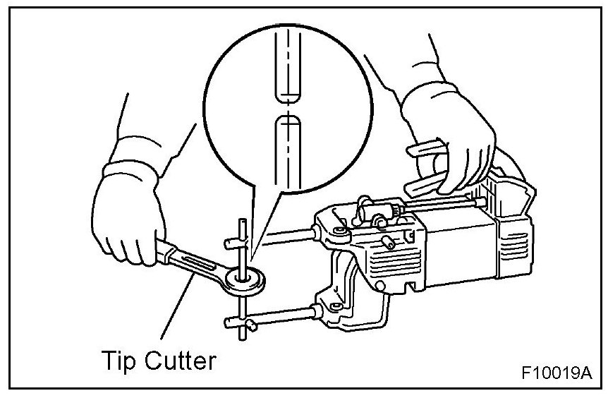 1. When welding panels with a combined thickness of over 3 mm (0.12 in.), use a MIG (Metal Inert Gas) welder for plug welding.