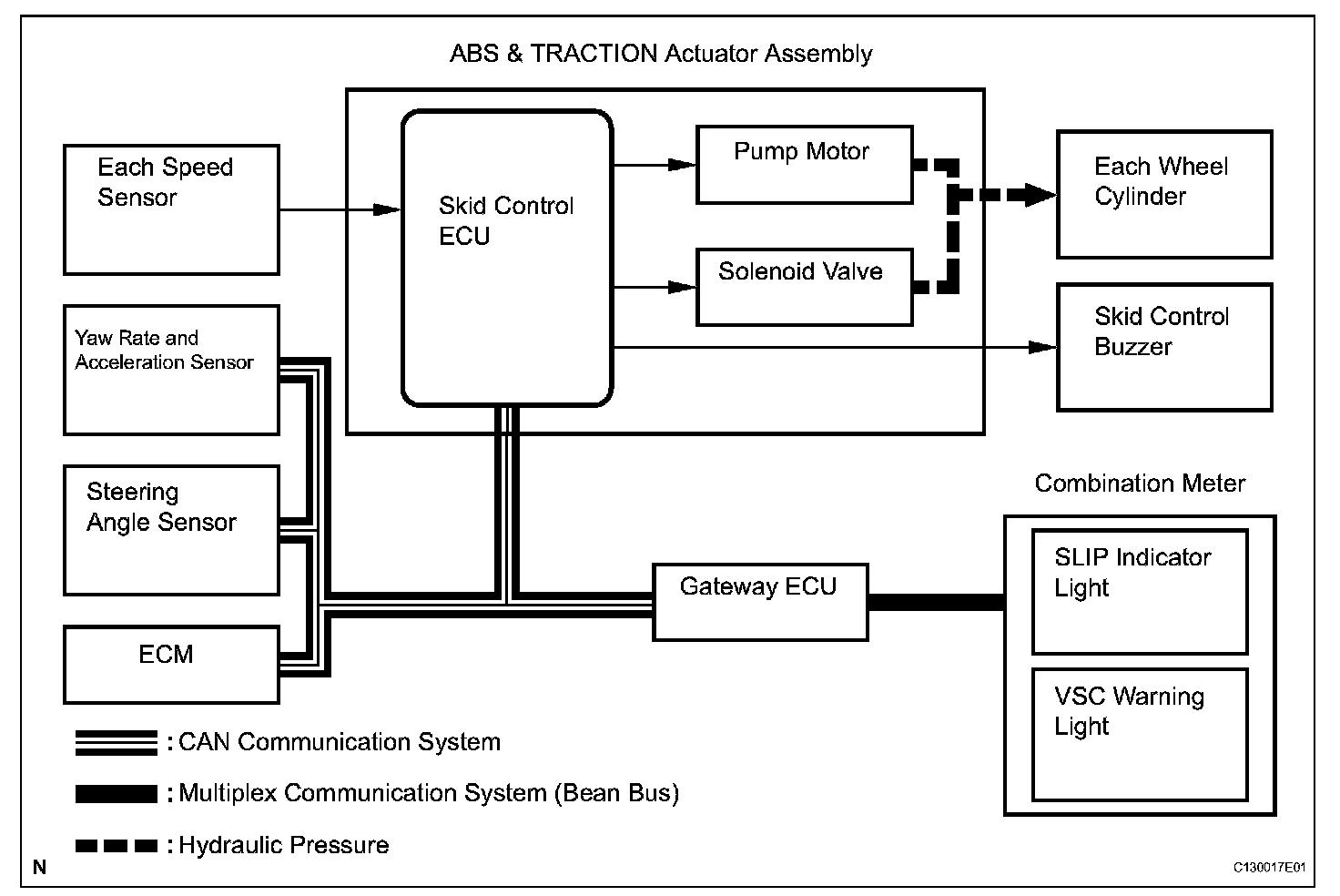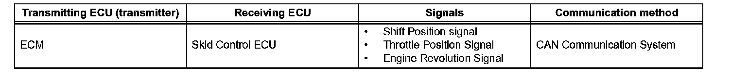 a. The skid control ECU calculates vehicle stability tendency based on the signals from the speed sensor, yaw rate and acceleration sensor and steering angle sensor. In addition, it evaluates the results of the calculations to determine whether any control actions (control of the engine output torque by electronic throttle control and the wheel brake pressure by the ABS & TRACTION actuator assembly ) should be implemented.