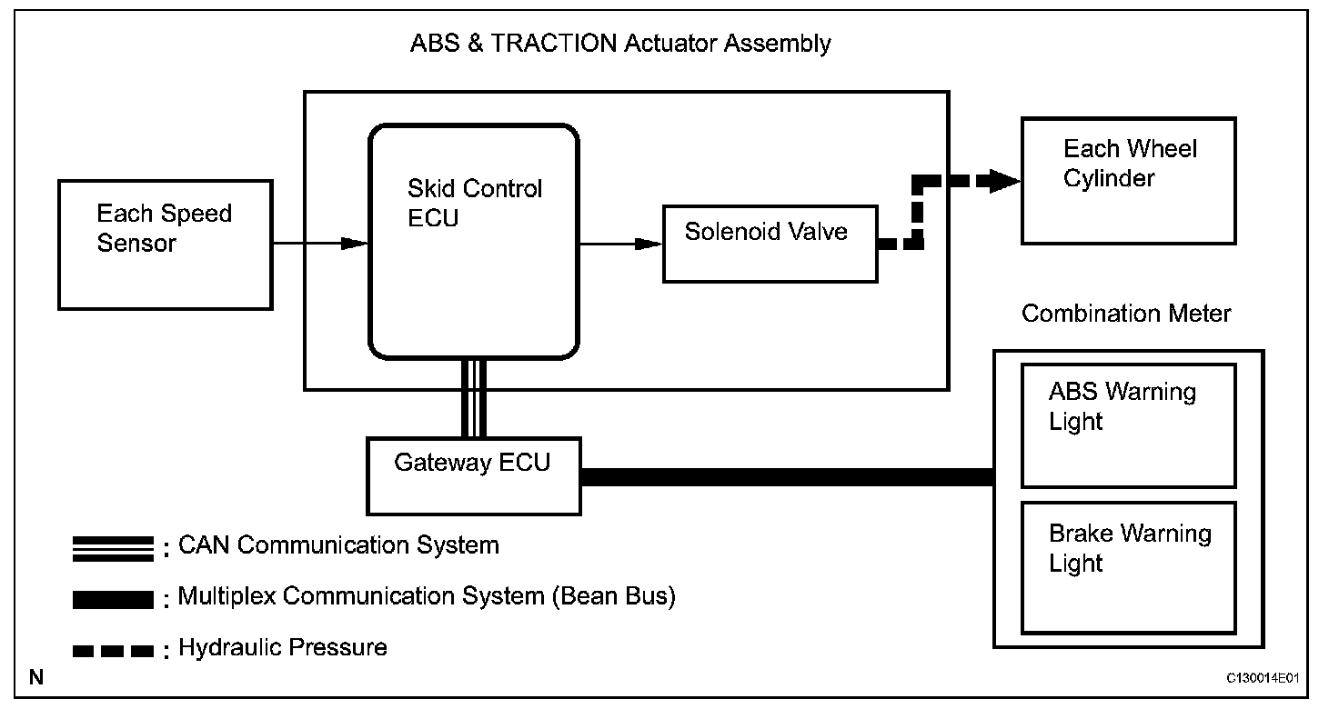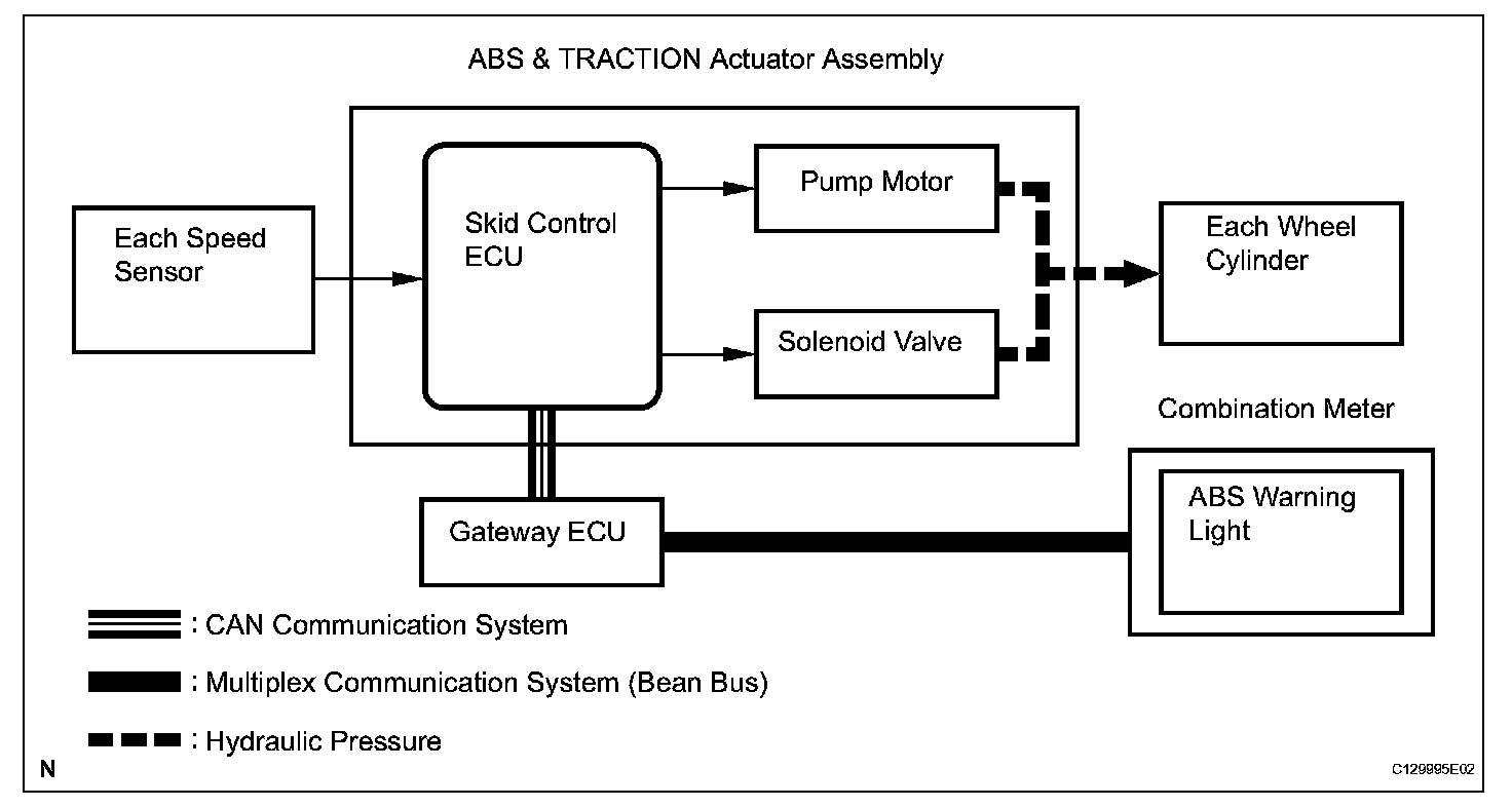 The skid control ECU detects wheel lock condition by receiving vehicle speed signals from each speed sensor, and sends control signals to the pump motor and solenoid valve. The pump motor and solenoid valve avoid wheel lock by controlling the hydraulic pressure of each wheel cylinder.