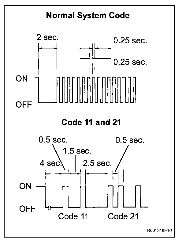 - As an example, the blinking patterns for a normal system code and trouble codes 11 and 21 are shown on the left.