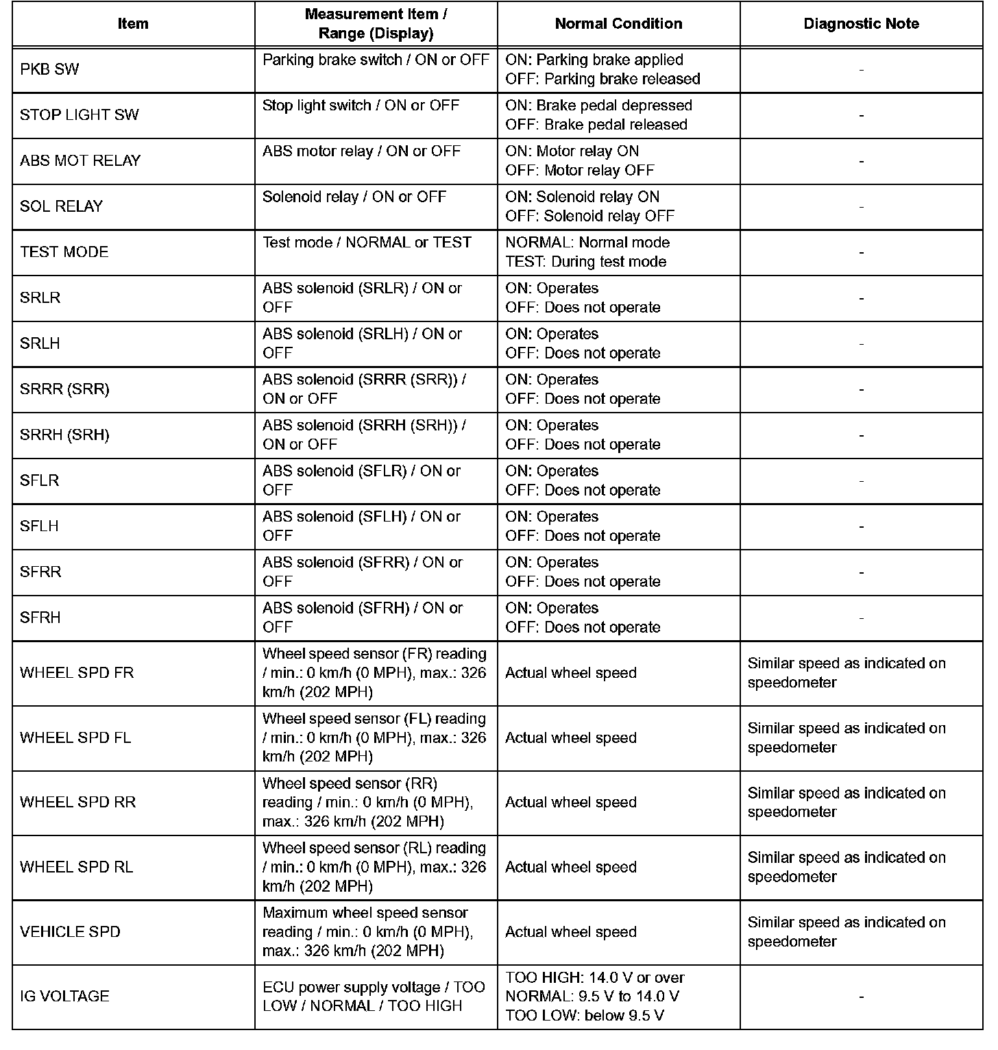 DATA LISTHINT: According to the DATA LIST displayed on the intelligent tester, the value and status of the switch, sensor, actuator and so on can be read without part removal. Reading the DATA LIST as the first step of troubleshooting is one of the methods to shorten labor time.