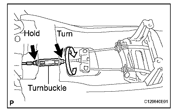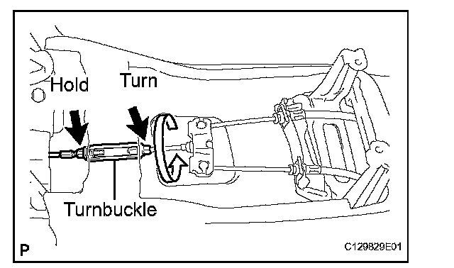 (c) Hold the nut on the parking brake cable assembly No.1 using a wrench. Tighten the turnbuckle of the parking brake cable assembly No.4 using a wrench.