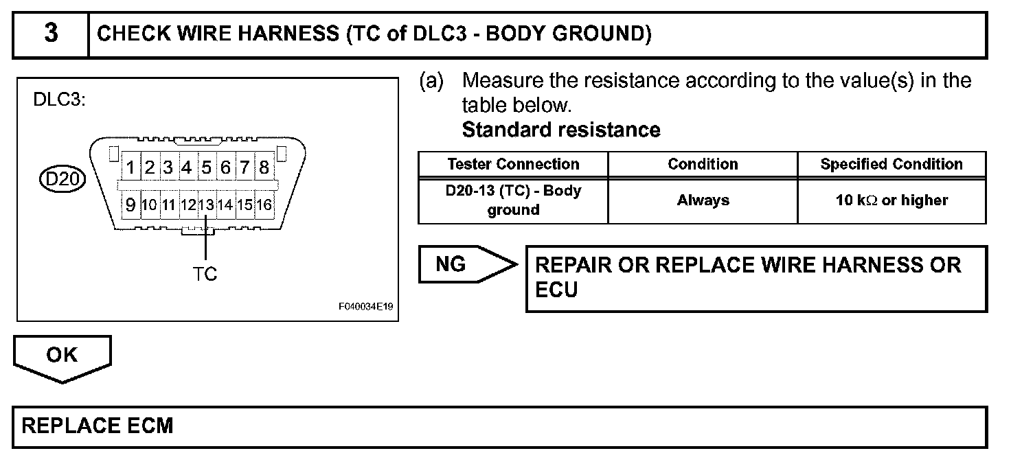 HINT: When a particular warning light remains blinking, a ground short in the wiring of terminal TC of the DLC3 or an internal ground short in the relevant ECU is suspected.