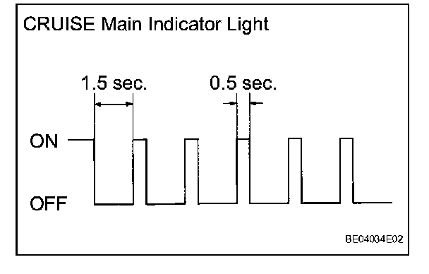 - If a malfunction occurs in the vehicle speed sensors, the stop light switch, or other related parts during cruise control driving, the ECU actuates AUTO CANCEL of the cruise control and blinks the CRUISE main indicator light. During constant speed control, the master warning light blinks. During vehicle-to-vehicle distance control, the master warning light comes on. This indicator light informs the driver of the malfunction. At the same time, the malfunction is stored as a diagnostic trouble code.