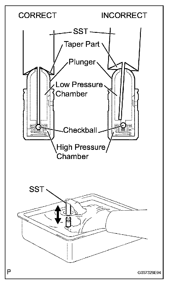 NOTICE: When bleeding high-pressure air from the compression chamber, make sure that the tip of SST is actually pressing the checkball as shown in the illustration. If the checkball is not pressed, air will not bleed.