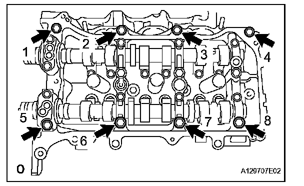^ Install the camshaft housing sub-assembly LH within 3 minutes and tighten the bolts within 15 minutes after applying seal packing.
