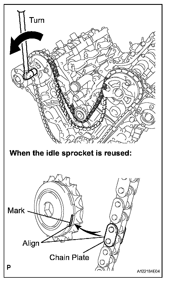 NOTICE: When the idle sprocket is reused, align the chain plates with the marks on the sprocket in order to tighten the chain between the banks.