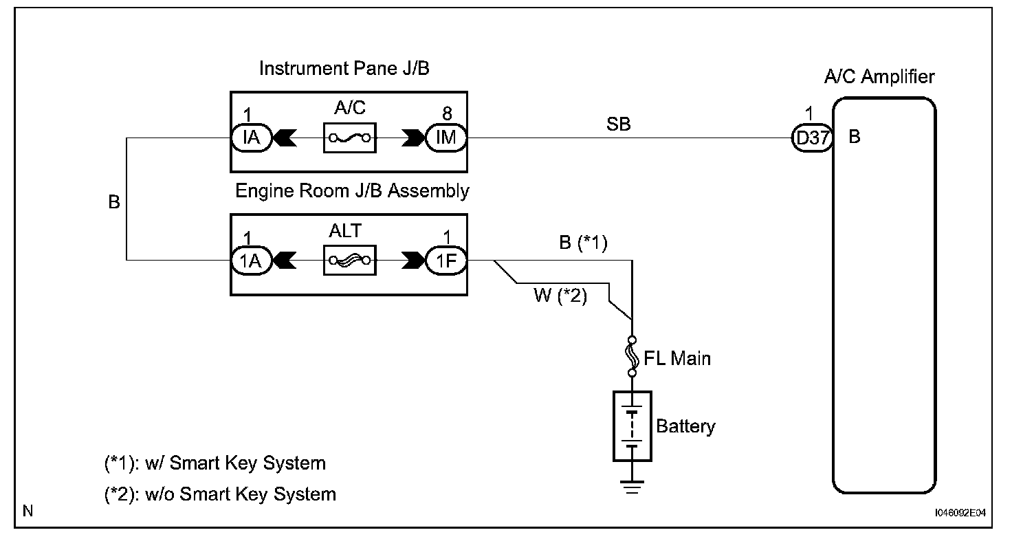 This is back-up power source circuit for the A/C amplifier. Power is supplied even when turning the ignition switch off and is used for diagnostic trouble code memory, etc.