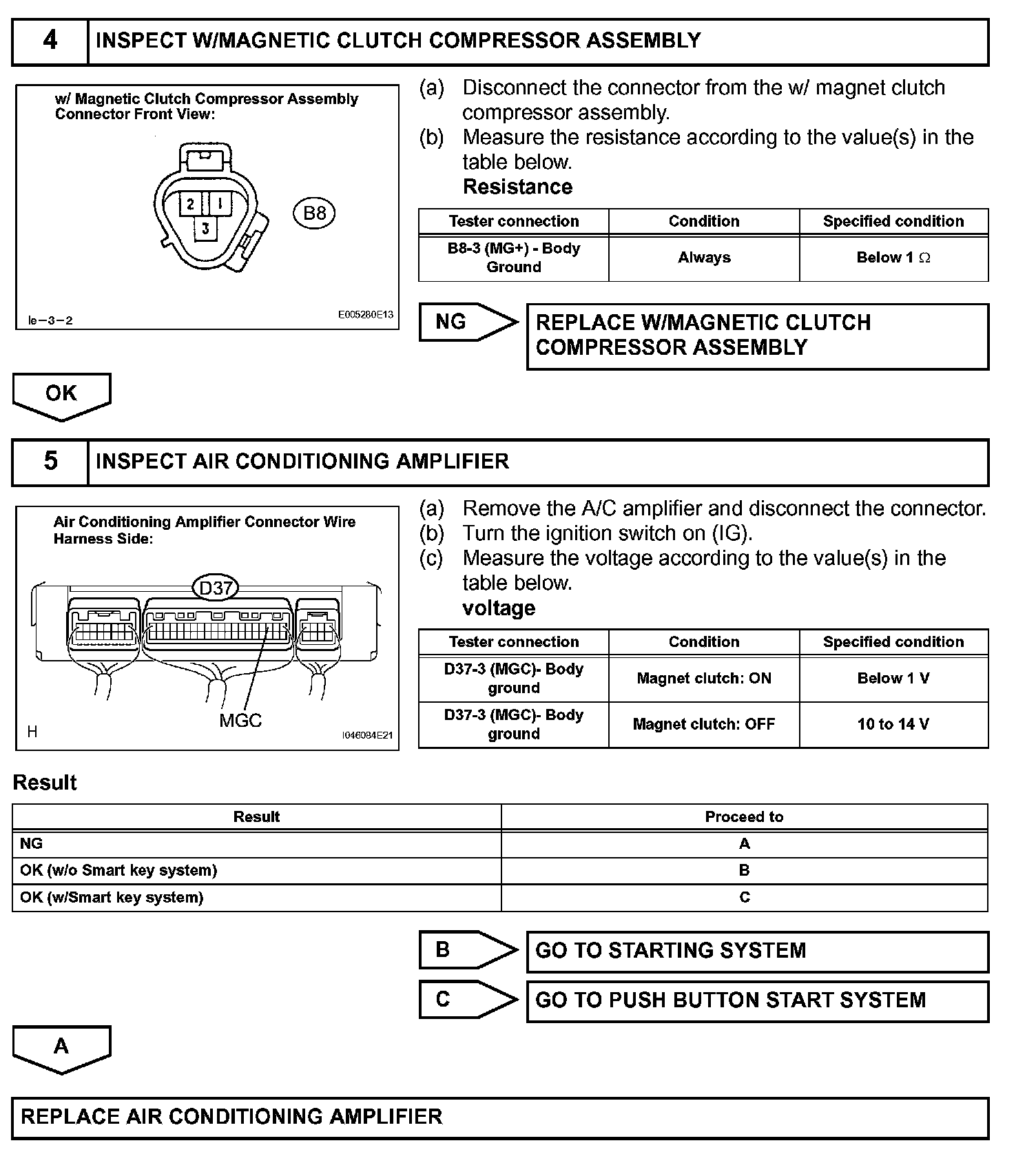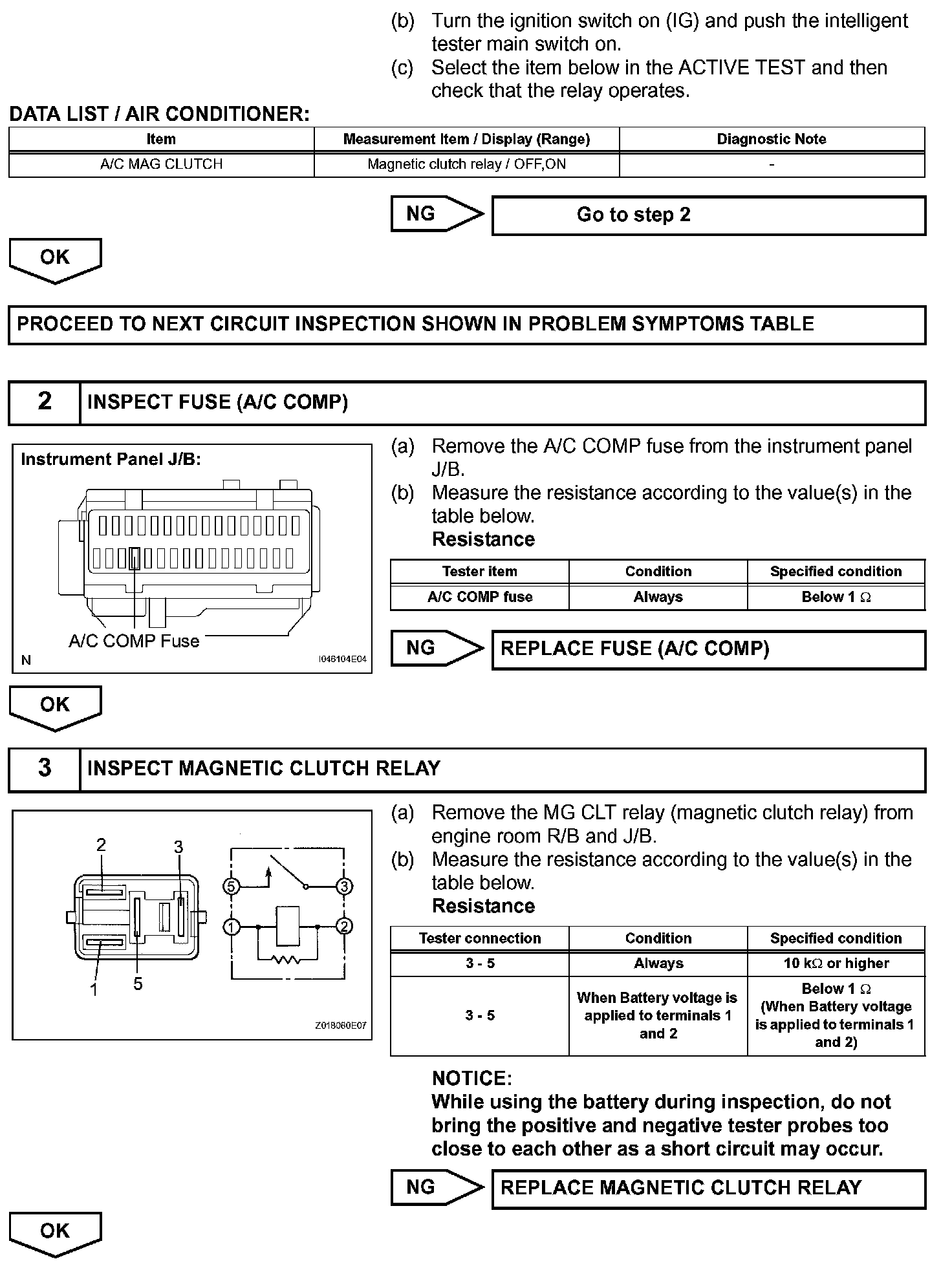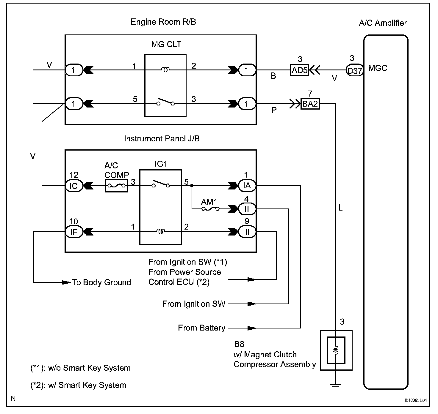 When the A/C switch is turned on, the magnetic clutch ON signal is sent from the MGC terminal of the A/C amplifier. Then, the MG CLT relay turns on to operate the magnetic clutch.