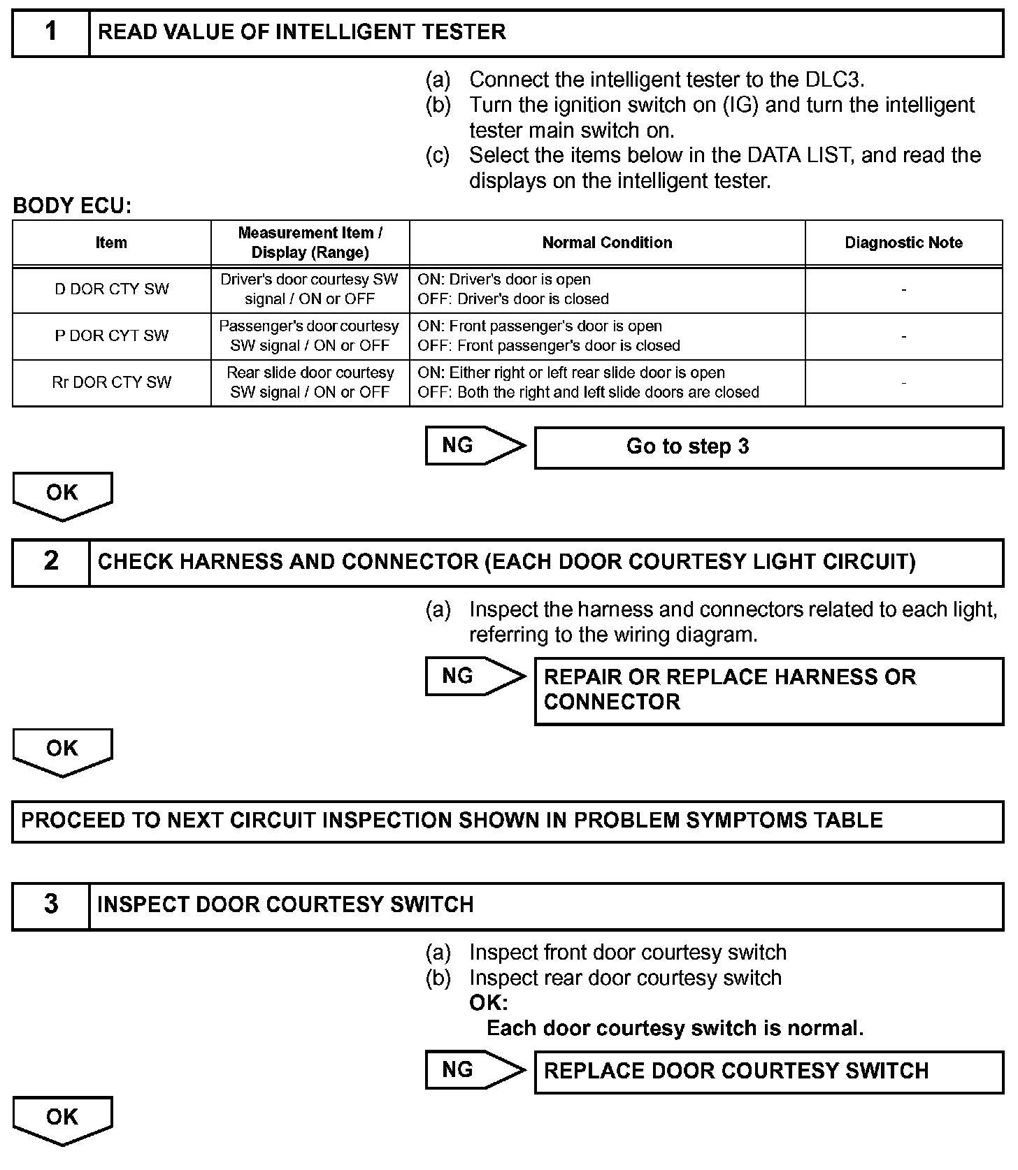 The body ECU detects the condition of the door courtesy switch assembly.