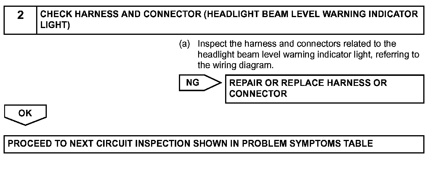 The headlight beam level warning indicator light in the combination meter assembly comes on for approximately 3 seconds when the ignition switch is turned on (IG). The headlight beam level warning indicator light also comes on when the headlight beam level control ECU detects a malfunction.