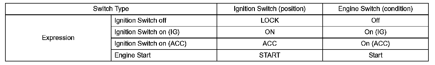 The type of ignition switch used on this model differs according to the specifications of the vehicle. The expressions listed in the given table are used.