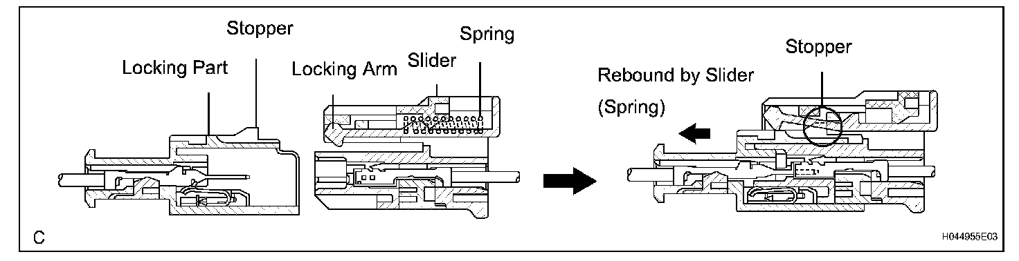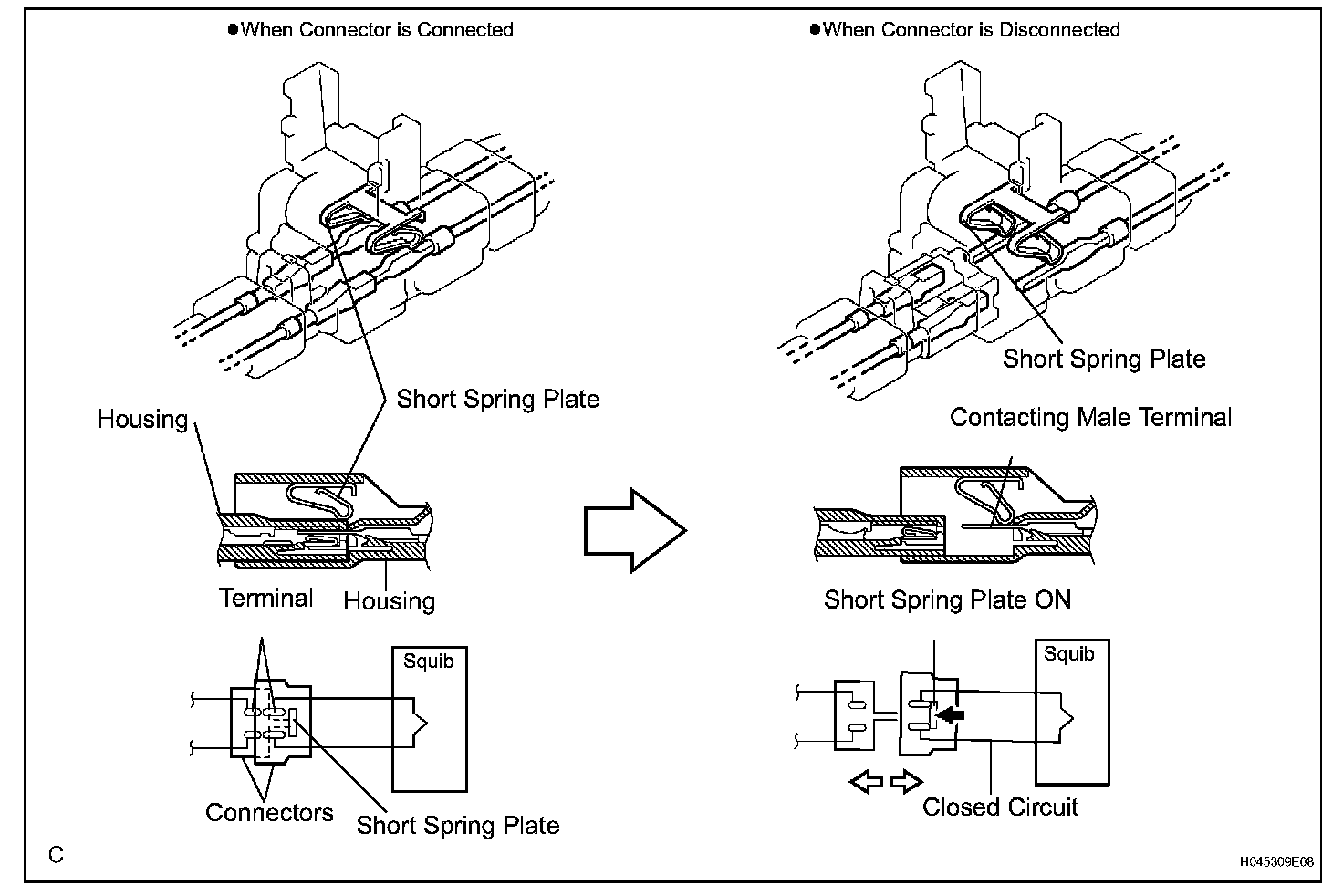 All connectors with an activation prevention mechanism contain a short spring plate. When these connectors are disconnected, the short spring plate creates a short circuit by automatically connecting the positive (+) and negative (-) terminals of the squib.
