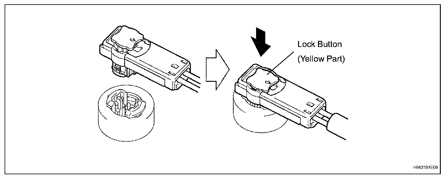 b. Push down securely on the lock button (yellow part) of the connector. (When locking, a click sound can be heard.)