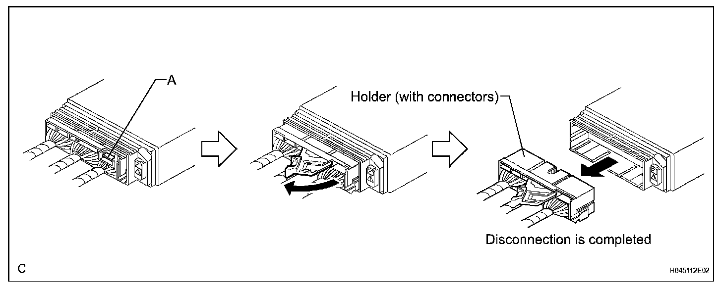 a. Pull the lever by pushing part A as shown in the illustration and disconnect the holder (with connectors).