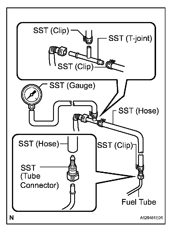 e. Install SST (pressure gauge) using SST and a fuel tube connector as shown in the illustration.