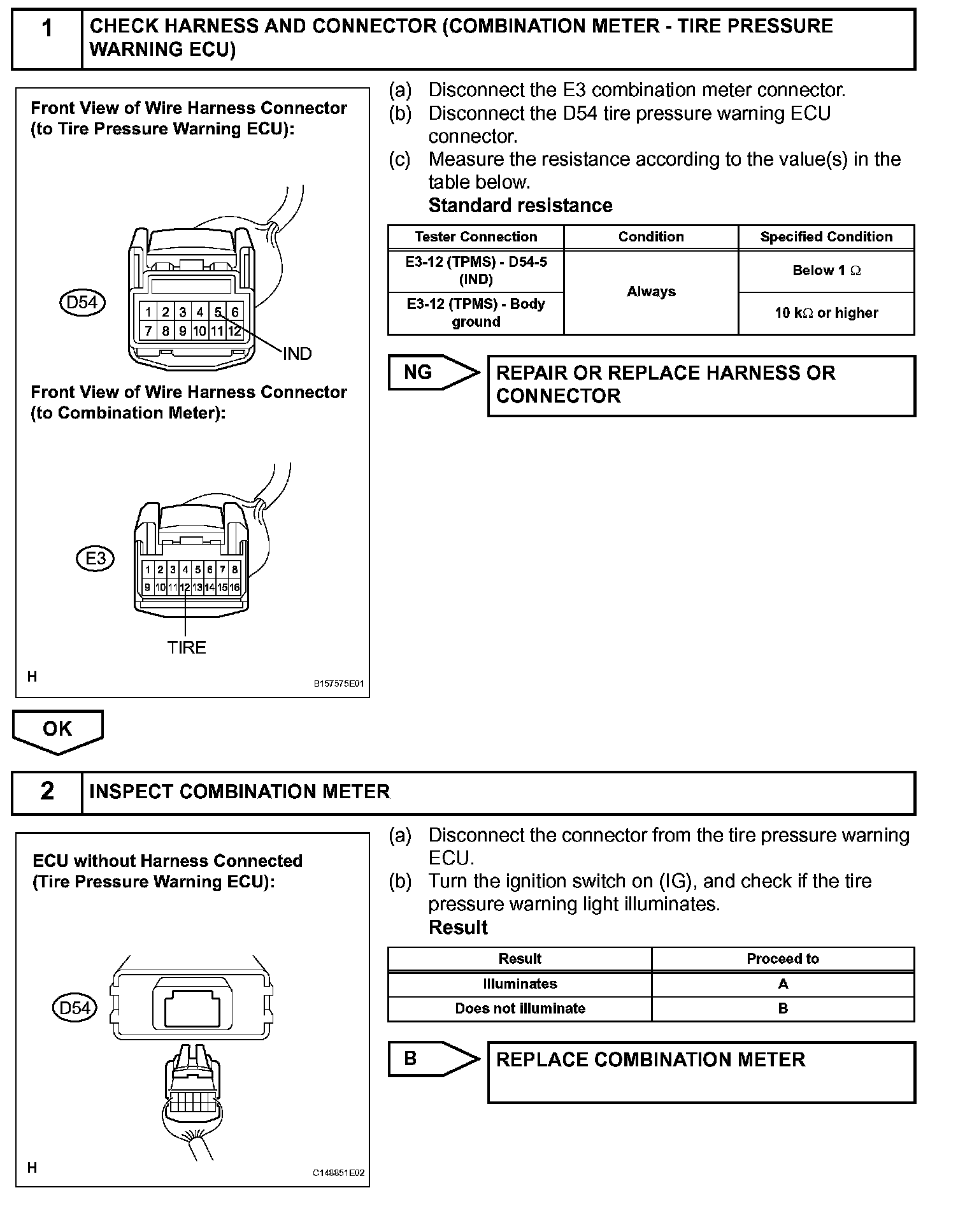 If the ECU detects trouble, the tire pressure warning light blinks (comes on after blinking for 1 minute) and tire pressure monitor is cancelled at the same time. At this time, the ECU records a DTC in the memory. Connect terminals TC and CG of DLC3 to make the tire pressure warning light blink and output the DTC.