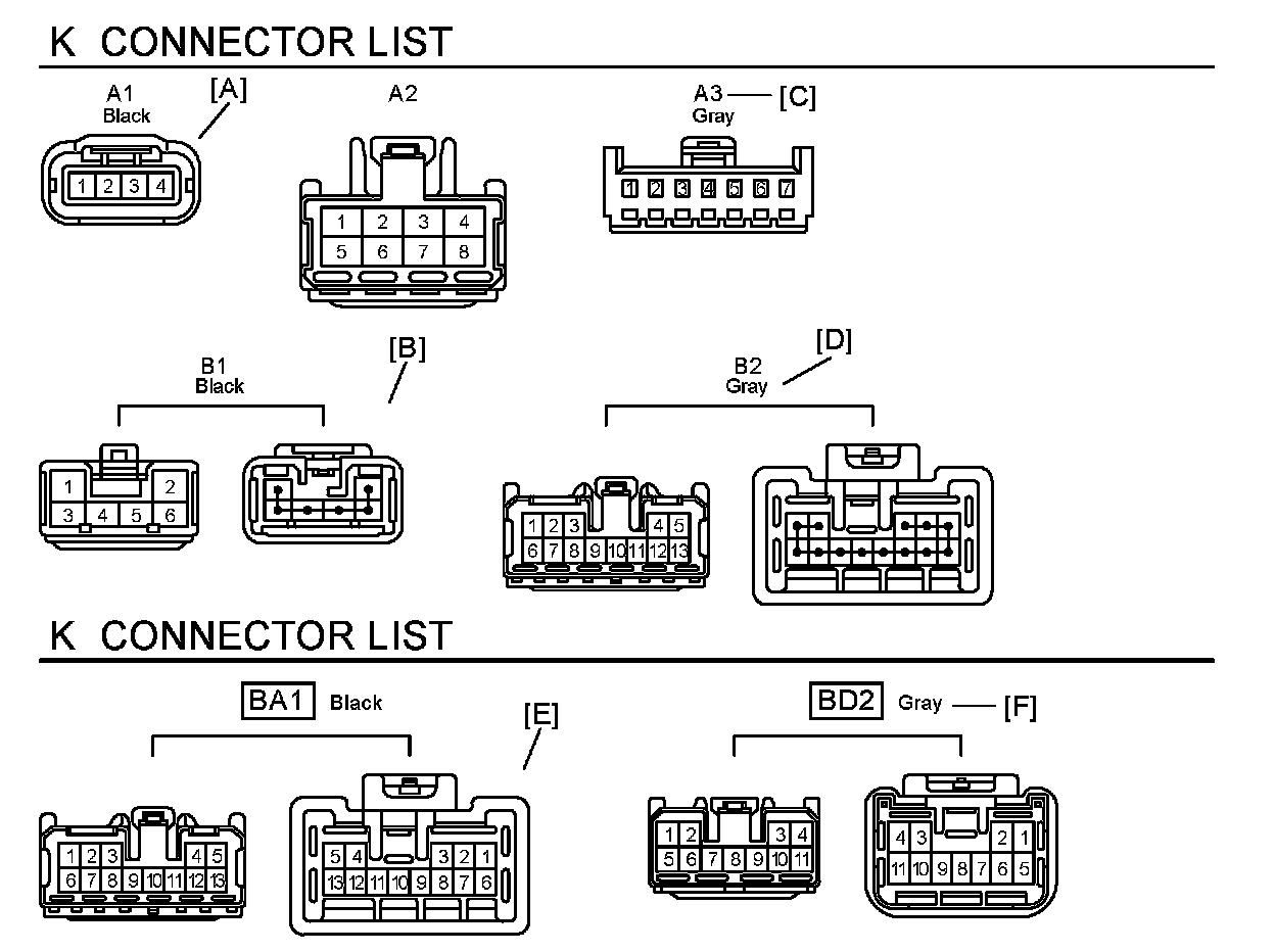 [E]: Indicates the connector shapes which are used to join wire harnesses.
