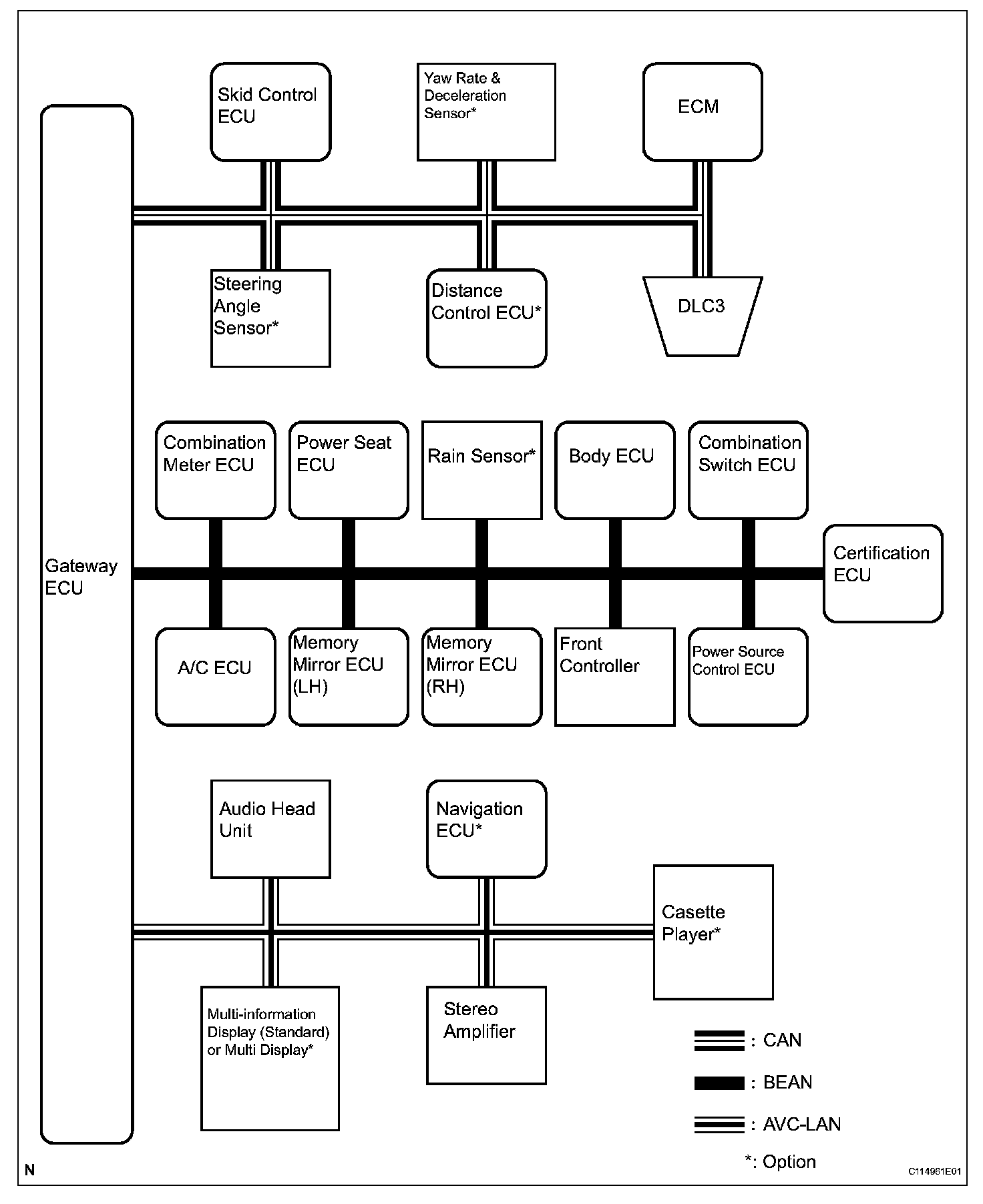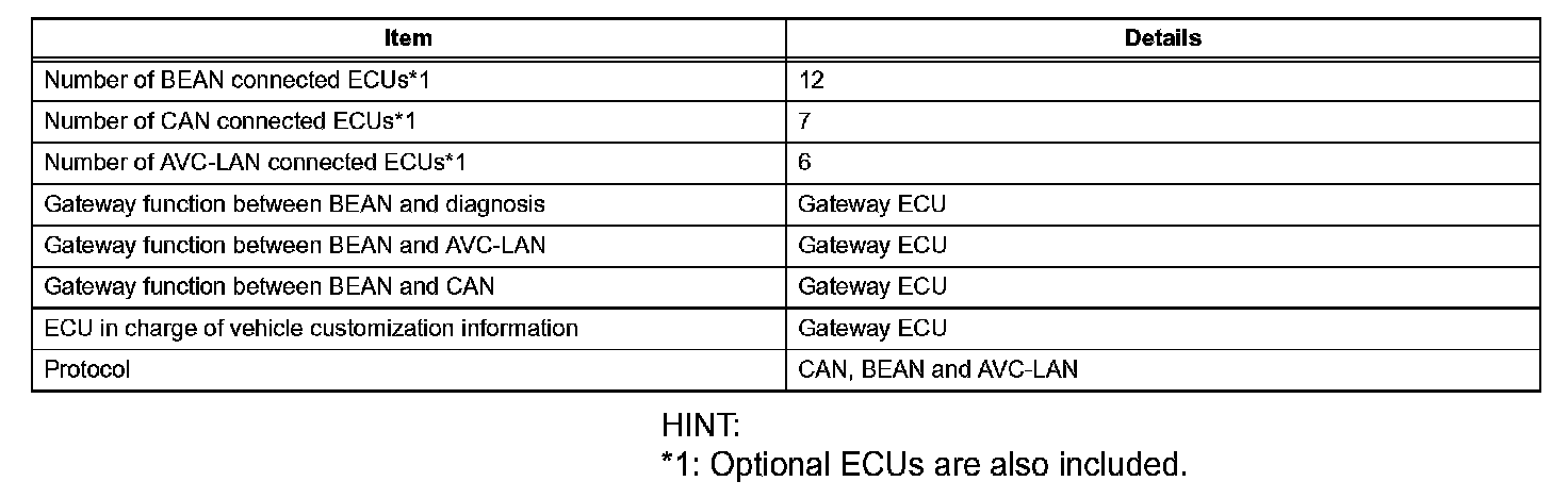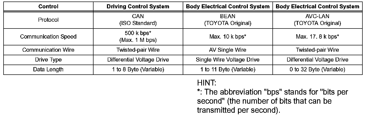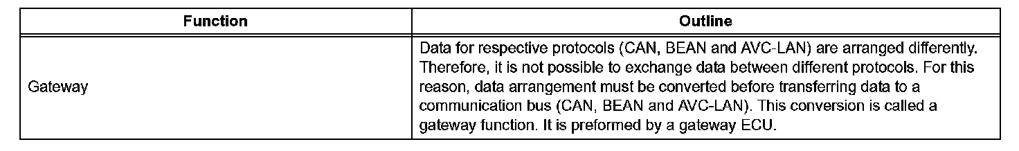 1. Protocols, which are rules for establishing data communication, differ between the CAN, BEAN and the AVC-LAN. If ECUs use different types of data such as communication speed, communication wire, and signals, they will be unable to communicate with each other.