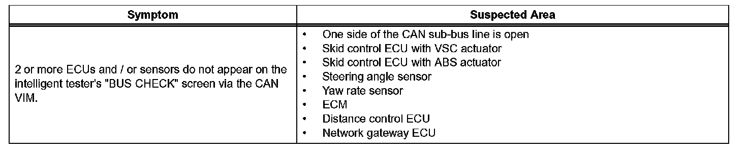 If 2 or more ECUs and / or sensors do not appear on the intelligent tester's "BUS CHECK" screen via the CAN VIM, one side of the CAN sub-bus line may be open. (One side of the CAN-H [sub-bus line] / CAN-L [sub-bus line] of the ECU and / or sensor is open.)