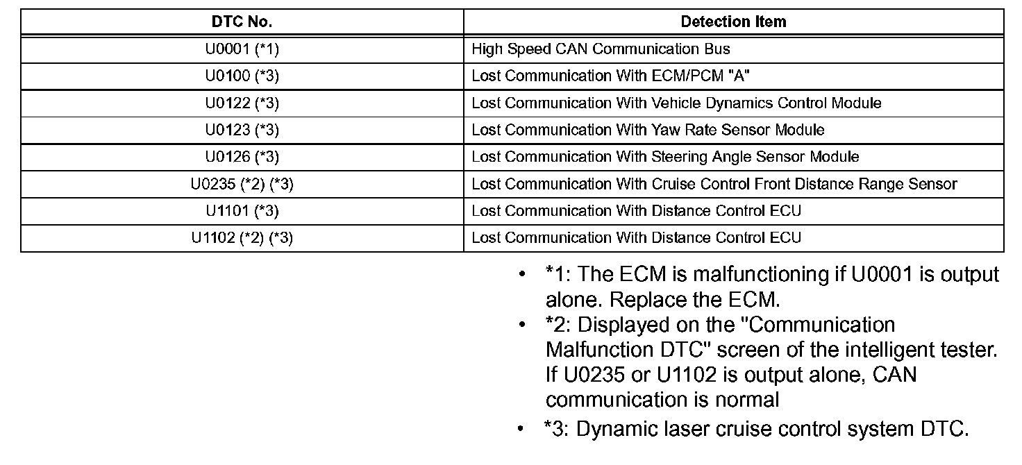 - If CAN communication system DTCs are output, trouble cannot be determined only by the DTCs. Perform troubleshooting according to "HOW TO PROCEED WITH TROUBLE SHOOTING". (If, however, U0235 or U1102 is output alone, check the dynamic laser cruise control system.)