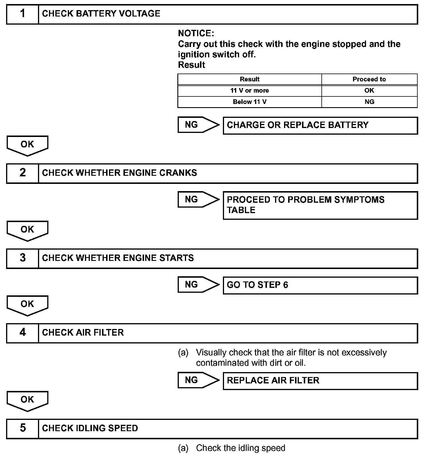 When a malfunction is not confirmed by the DTC check, troubleshooting should be carried out in all circuits considered to be possible causes of the problem. In many cases, by carrying out the basic engine check shown in the flowchart, the location of the problem can be found quickly and efficiently. Therefore, using this check is essential when engine troubleshooting.