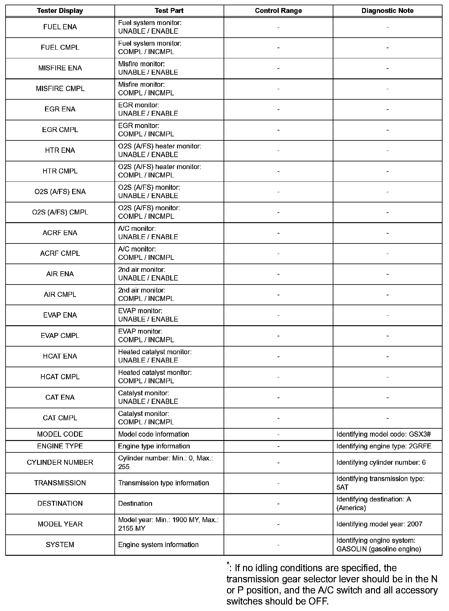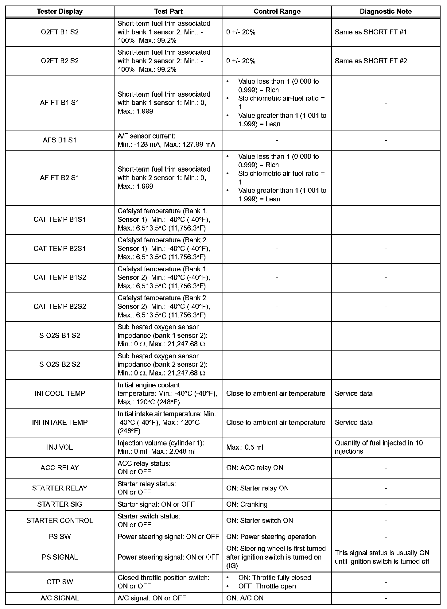 DATA LISTHINT: Reading the DATA LIST displayed on an intelligent tester enables values, including those of the switches, sensors, and actuators, to be checked without removing any parts. Reading the DATA LIST as the first step in troubleshooting is one method to shorten diagnostic time.