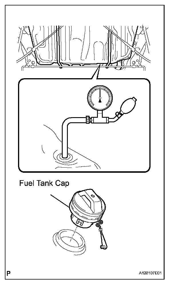 e. Remove the fuel tank cap, and check that the pressure drops. If the pressure does not drop, replace the fuel tank assembly.