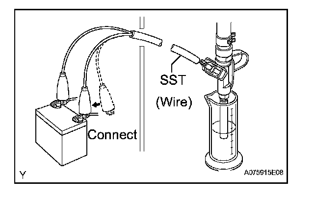 6. Connect SST (wire) to the injector and the battery for 15 seconds, and measure the injection volume with the graduated cylinder. Test each injector 2 or 3 times.