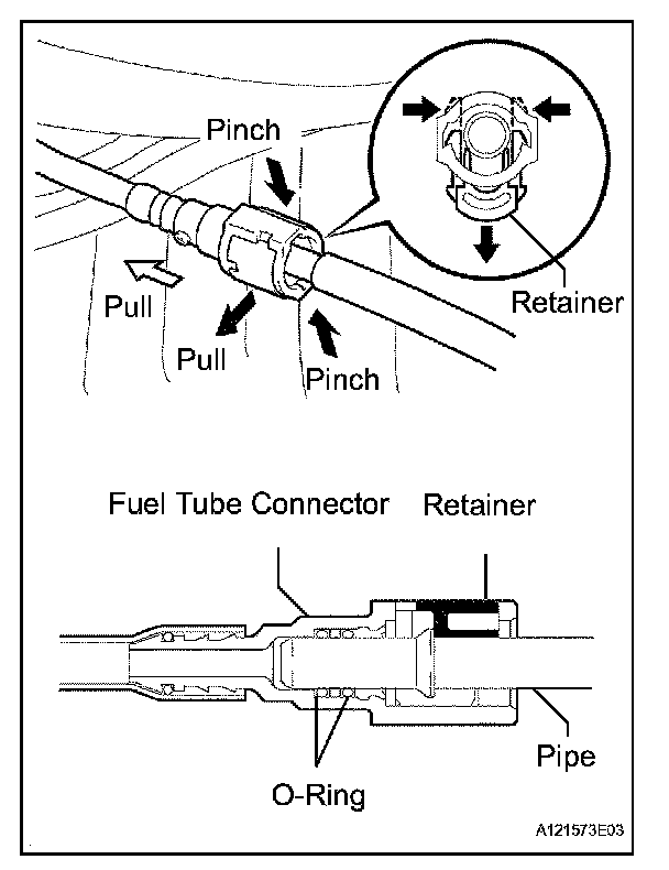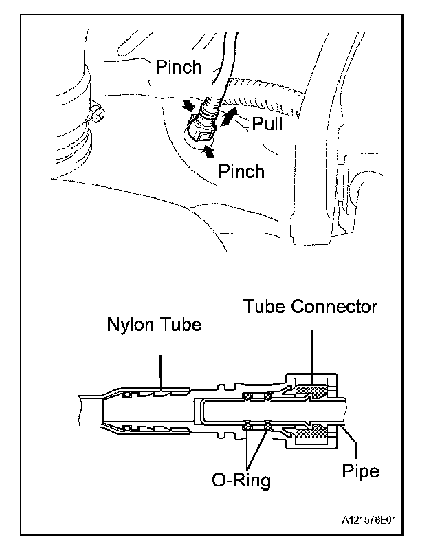 1. Pinch the tube connector and then pull out the fuel tube No.1.