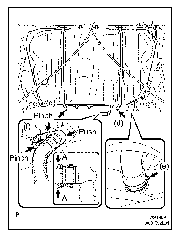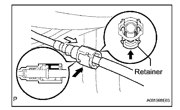 1. Push in the fuel pump tube connector to the pipe and push up the retainer so that the claws engage.